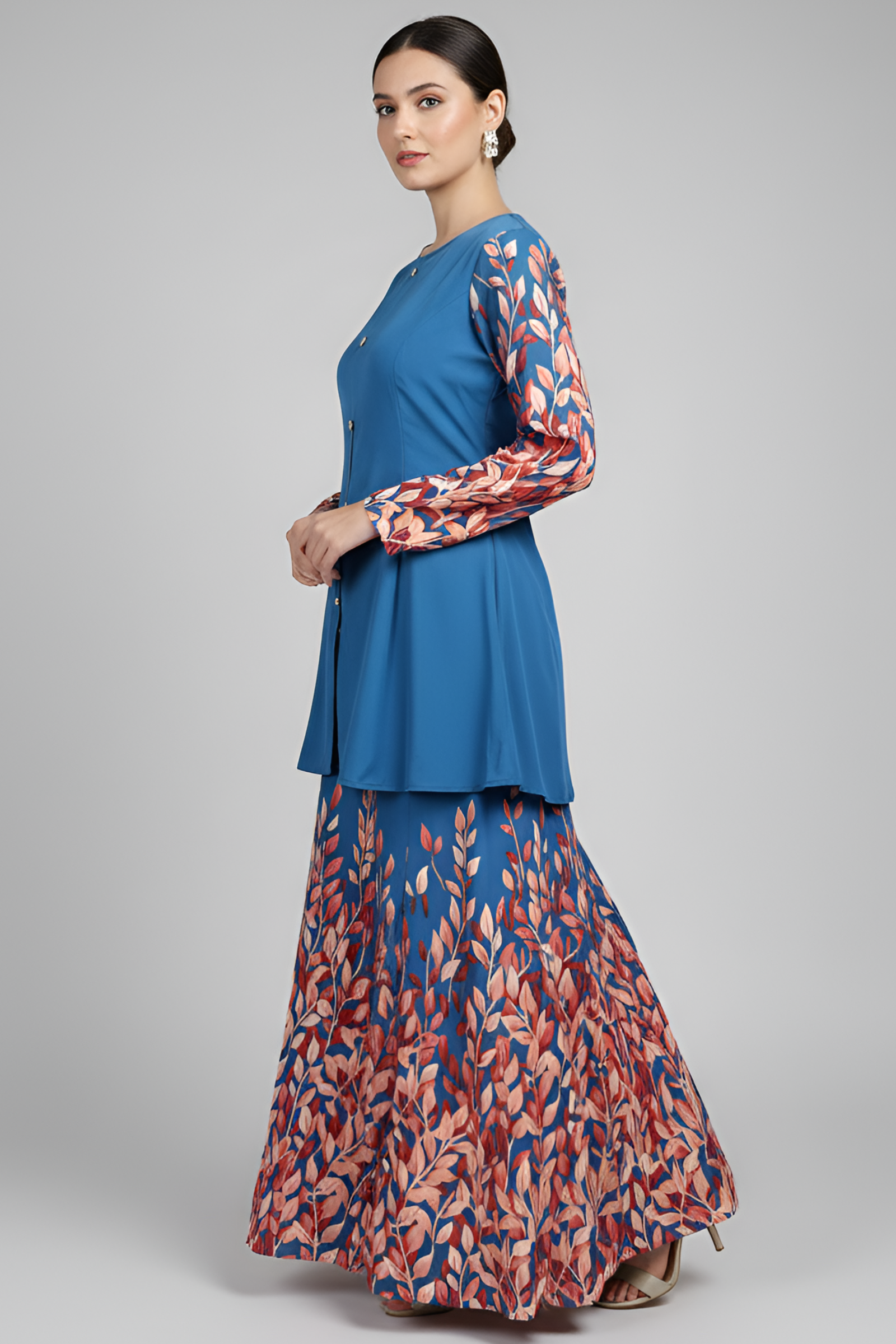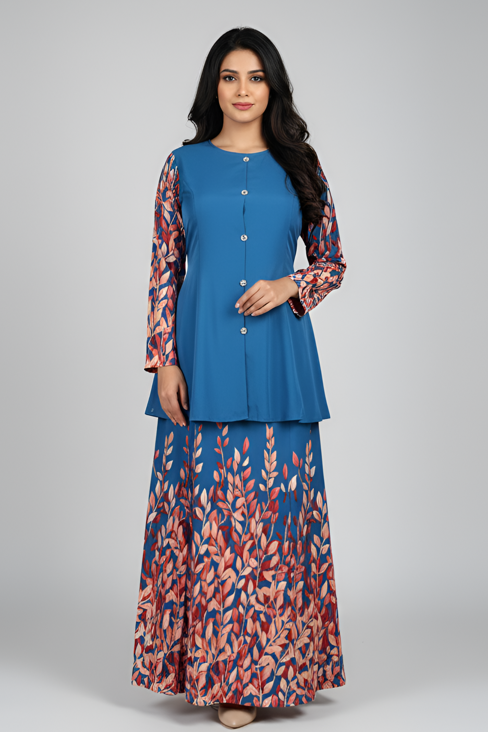 Step into refined elegance with the Azure Bloom Women’s Co-ord Dress with Skirt, a graceful two-piece ensemble that blends modern minimalism with botanical charm. The serene azure blue base is beautifully contrasted with warm leaf-inspired prints in coral and amber tones, flowing from the sleeves to the hemline. Designed in premium imported fabric, this dress offers a fluid silhouette that drapes effortlessly, creating a timeless style perfect for both formal occasions and festive gatherings.