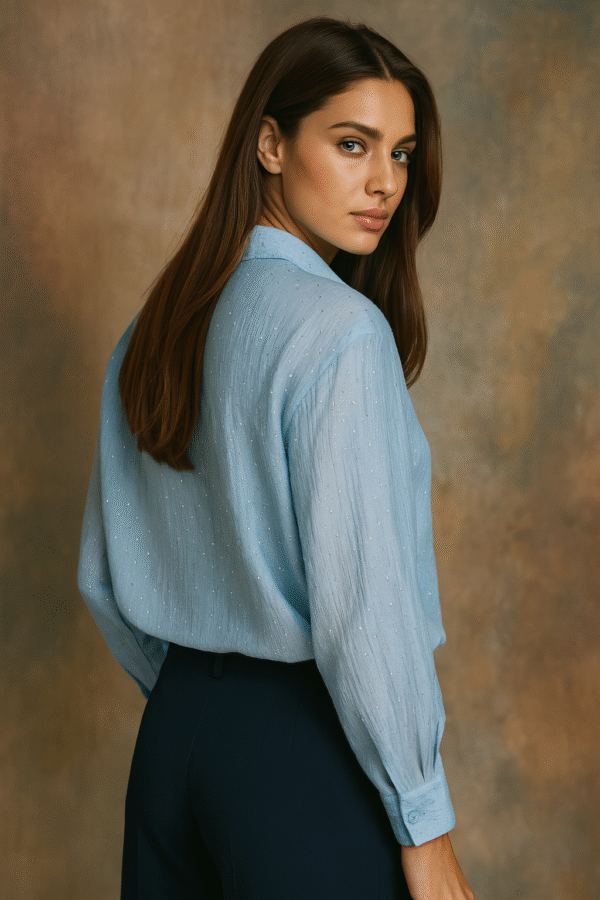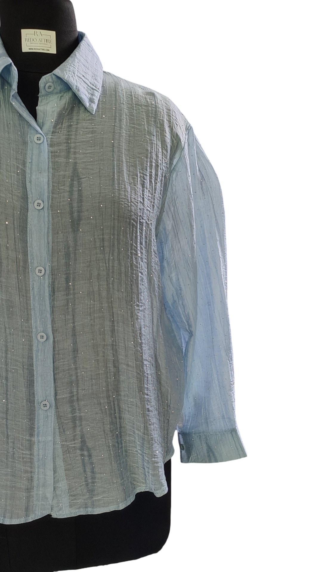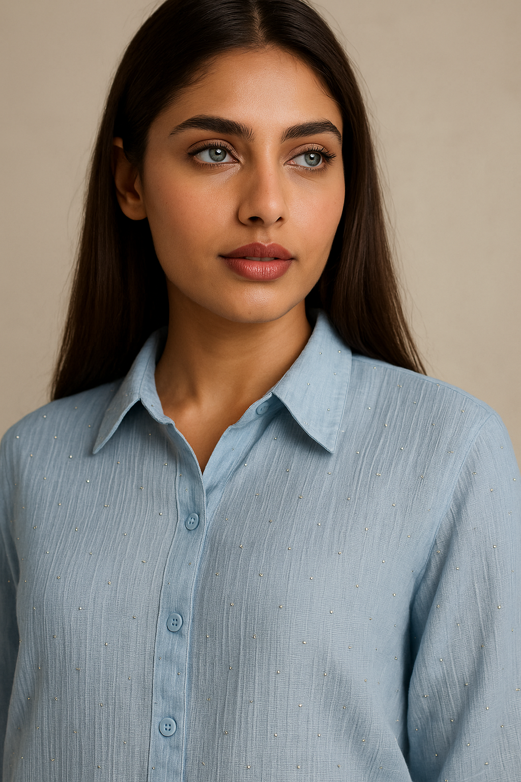 Crafted from lightweight textured premium imported fabric, this shirt features a subtle vertical crinkle texture adorned with delicate micro-bead accents that catch the light beautifully. The breathable fabric ensures comfort while the refined beadwork adds a touch of understated luxury.