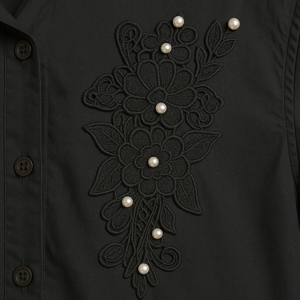 Step into the spotlight with this luxurious black party shirt designed to make a statement. Crafted from premium imported fabric, this shirt combines elegance with modern sophistication. The delicate lace collar exudes charm, while the intricate floral embroidery adorned with lustrous pearl embellishments adds a touch of opulence.
