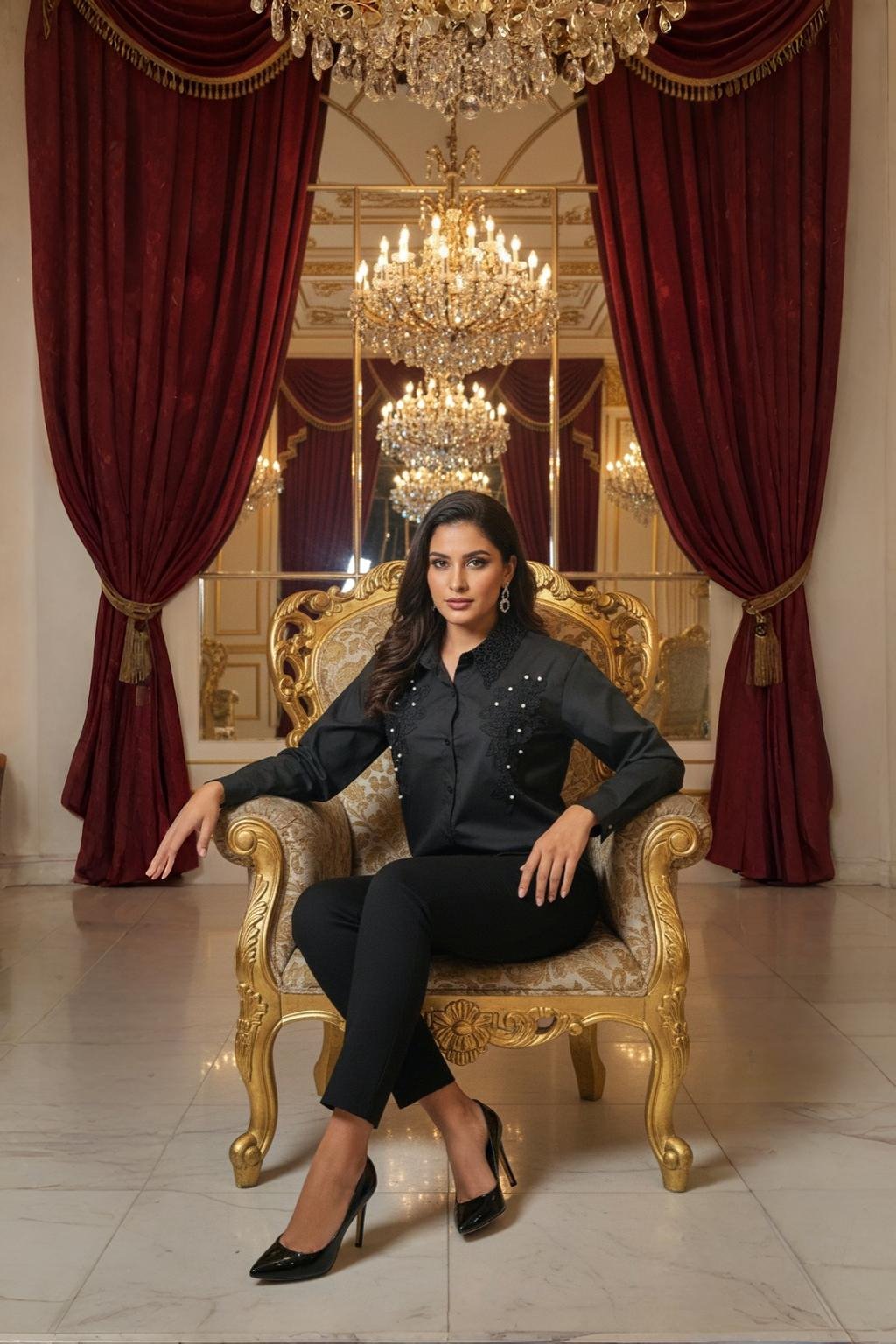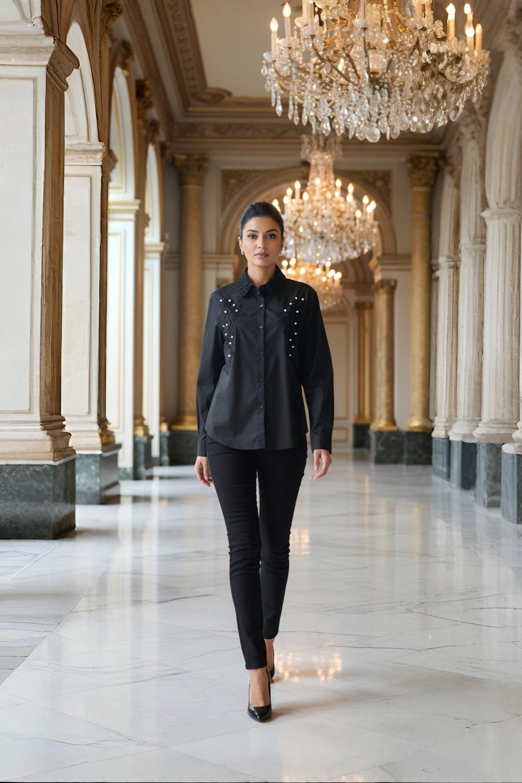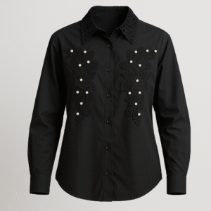 Whether styled for a glamorous evening, a cocktail party, or a chic dinner date, this shirt transforms classic black into an extraordinary expression of style. Effortlessly graceful and endlessly versatile, it’s a true wardrobe investment piece for the modern woman.