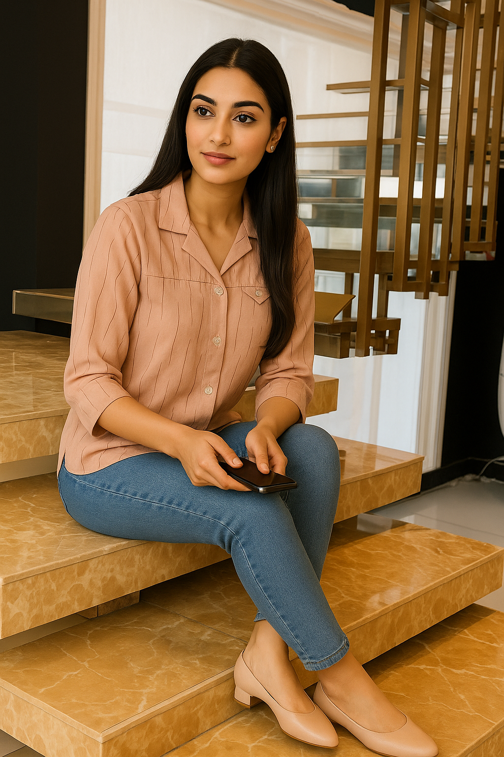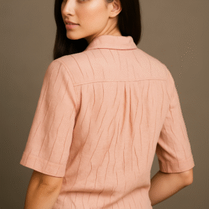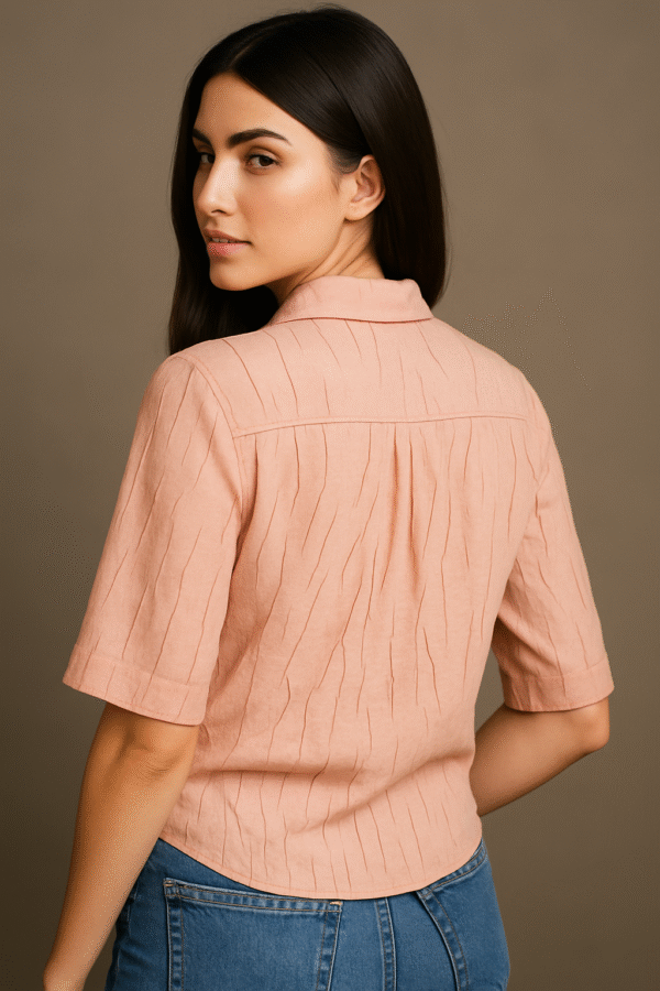 Step into a world of subtle charm with our Blush Pink 3/4 Sleeve Top which gives you look of the Shirt, a beautiful blend of modern comfort and vintage femininity. The top features an elegant collared neckline, delicate vertical stitch detailing.