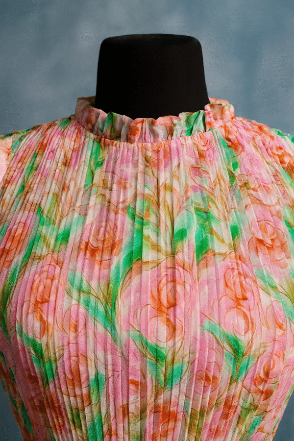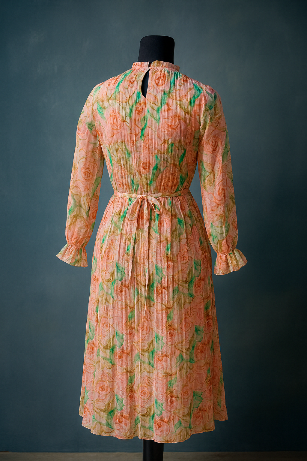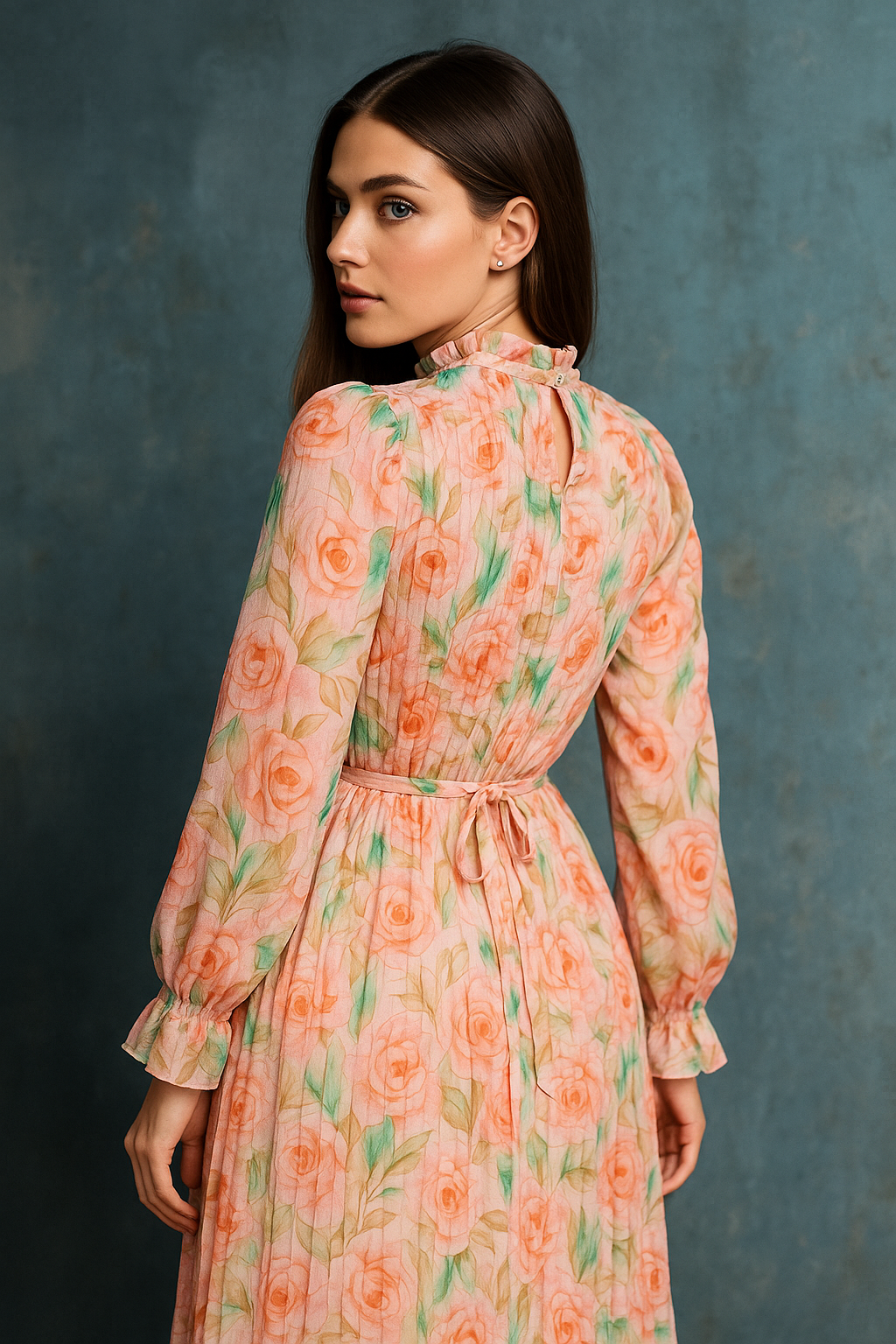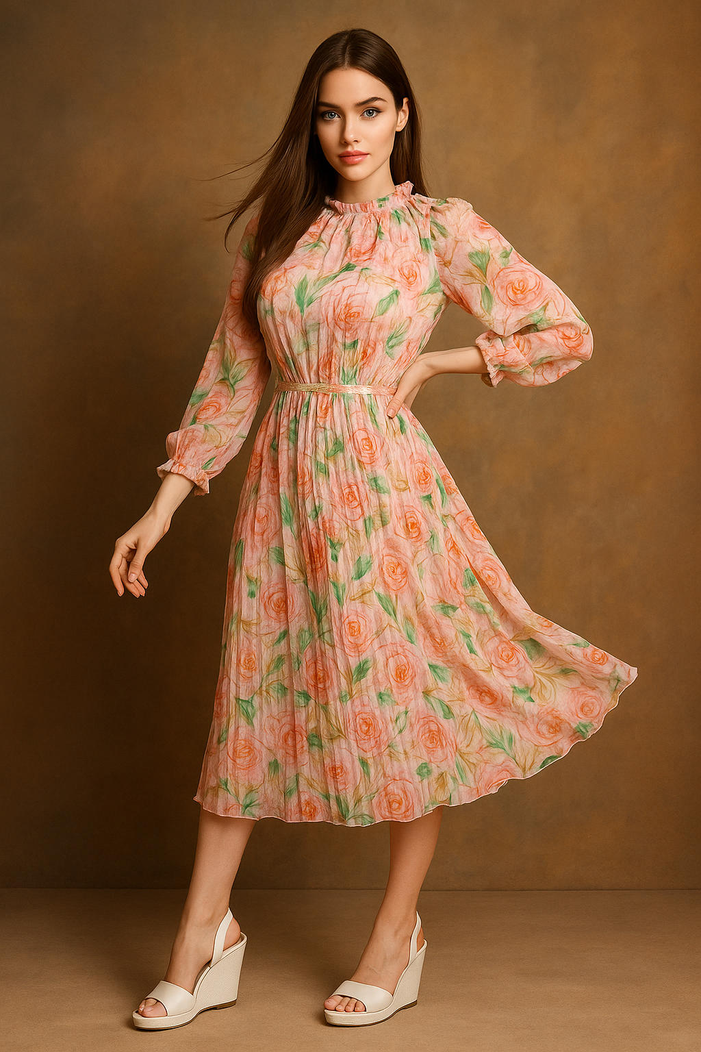 Step into a world of timeless romance with this blush rose bloom midi dress, a piece that beautifully captures femininity and grace. Crafted in premium imported fabric, this flowy silhouette features delicate pleats, a softly cinched waist, and full-length sheer sleeves with gathered cuffs. The dreamy rose print in hues of coral and green is painted against a blush backdrop, evoking the freshness of spring gardens. Designed for women who love elegance with ease, this floral midi dress is versatile enough for brunches, parties, and graceful evening outings.