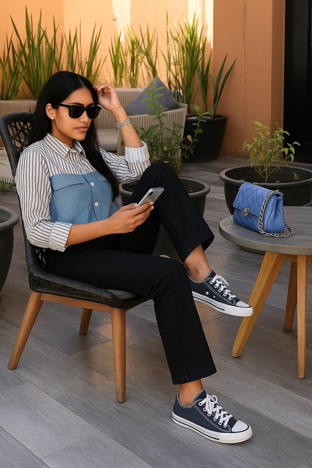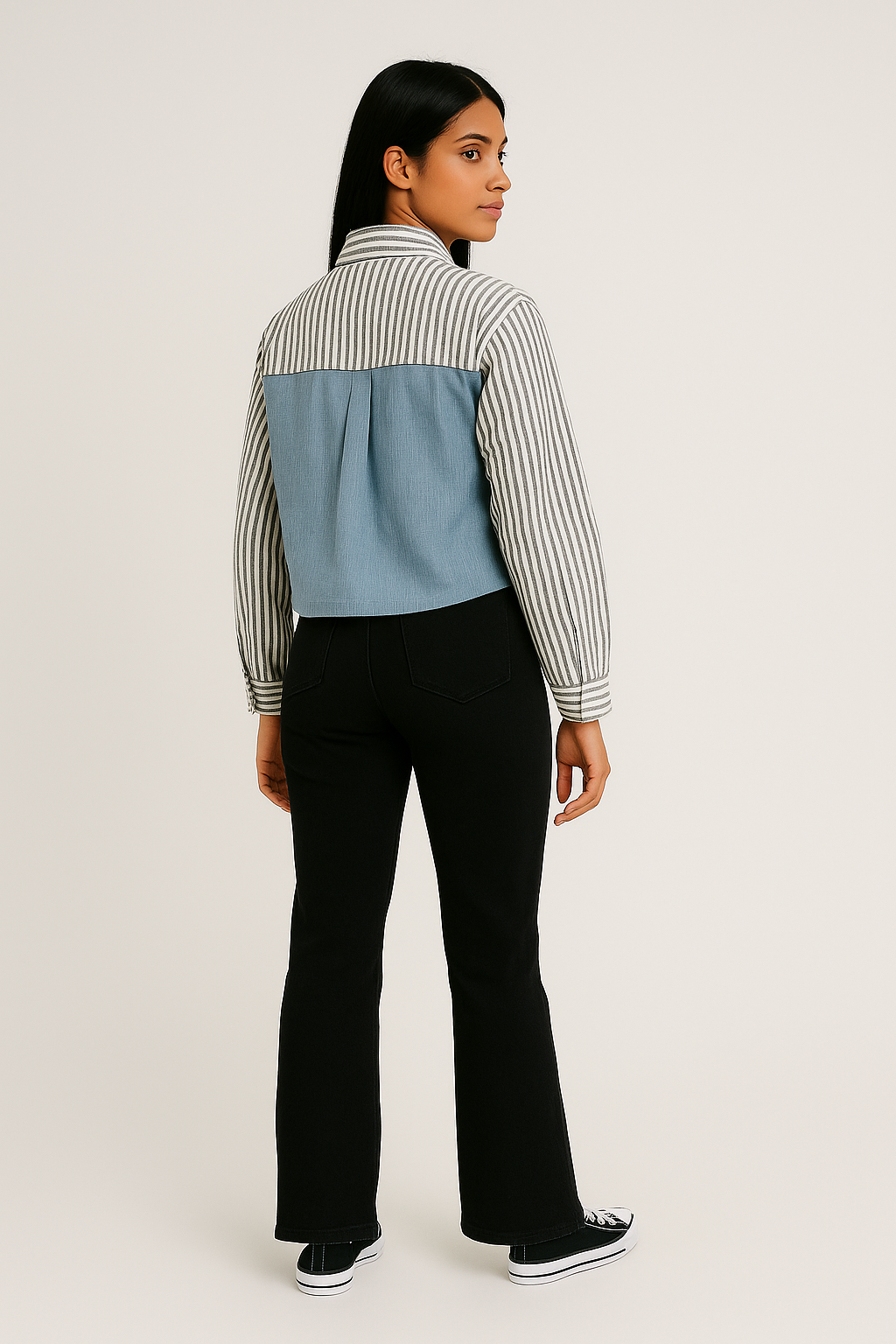 Where timeless stripes meet a soft denim twist β this shirt is a subtle showstopper for the woman who rules both the boardroom and the boulevard. Its structured fit and paneled elegance make it your go-to for smart-casual days and style-forward evenings.