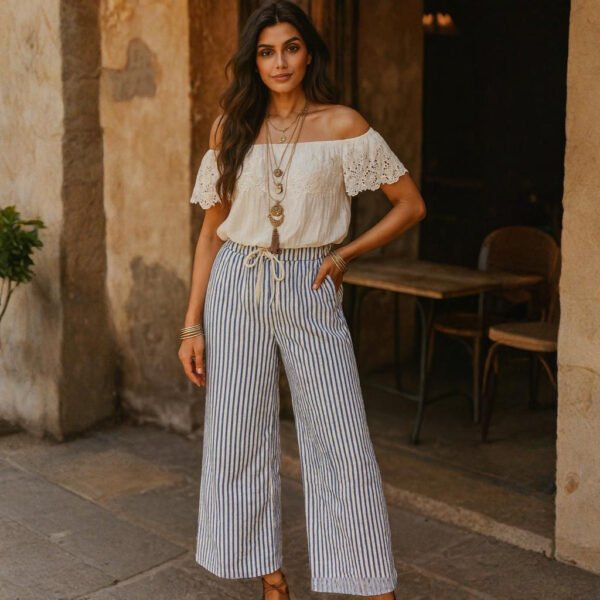 Meet your new go-to wardrobe essential: the Coastal Striped Palazzo Pants, crafted for women who seek comfort with chic versatility. Designed in premium imported fabric, these wide-leg trousers combine a breezy silhouette with nautical-inspired vertical stripes that elongate the frame.