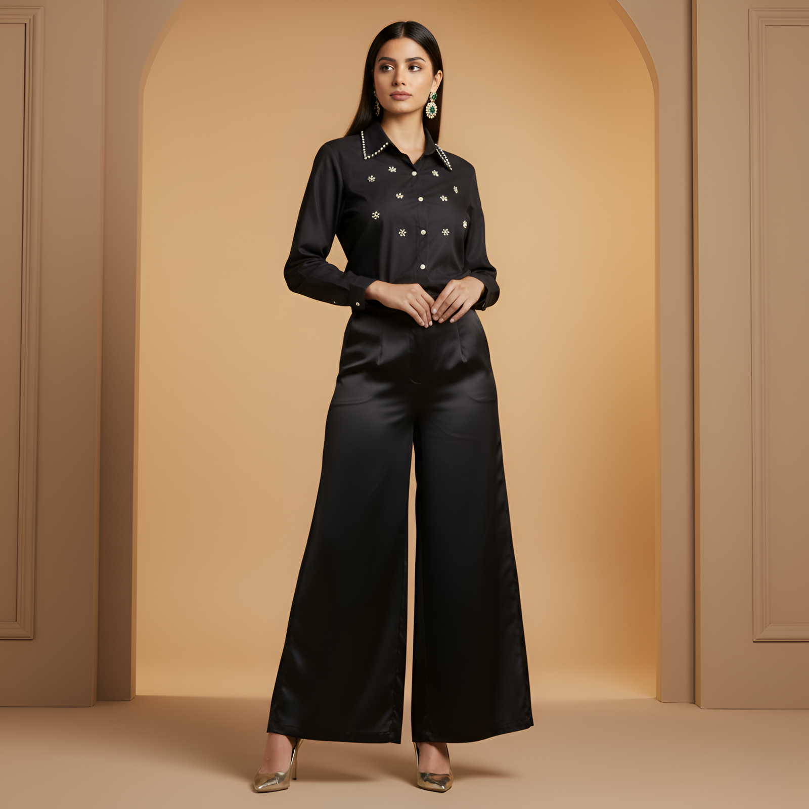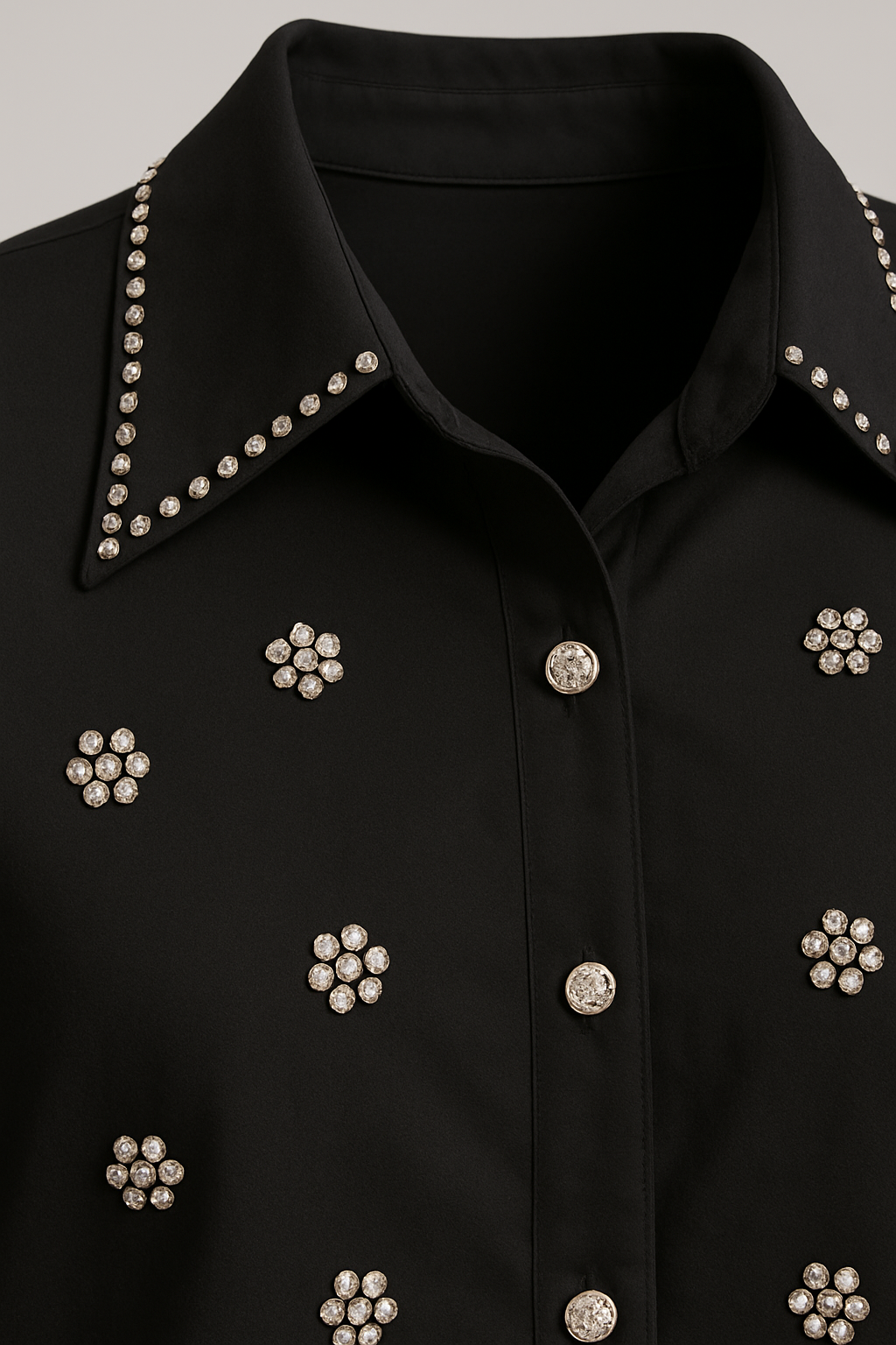 Step into the spotlight with our Crystal Embellished Designer Black Party Shirt, an epitome of modern elegance and timeless charm. Designed for the woman who loves to make a statement, this black party shirt features exquisite crystal embellishments on the collar and front, creating a sophisticated sparkle that is both refined and glamorous.
