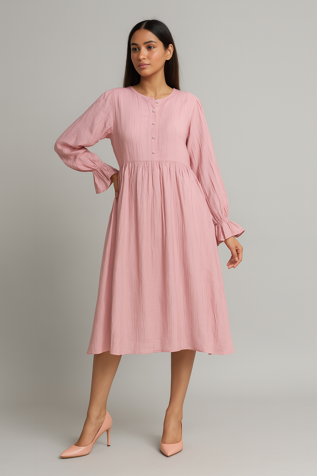 “Pink cotton pleated midi dress with button front and full sleeves for women”