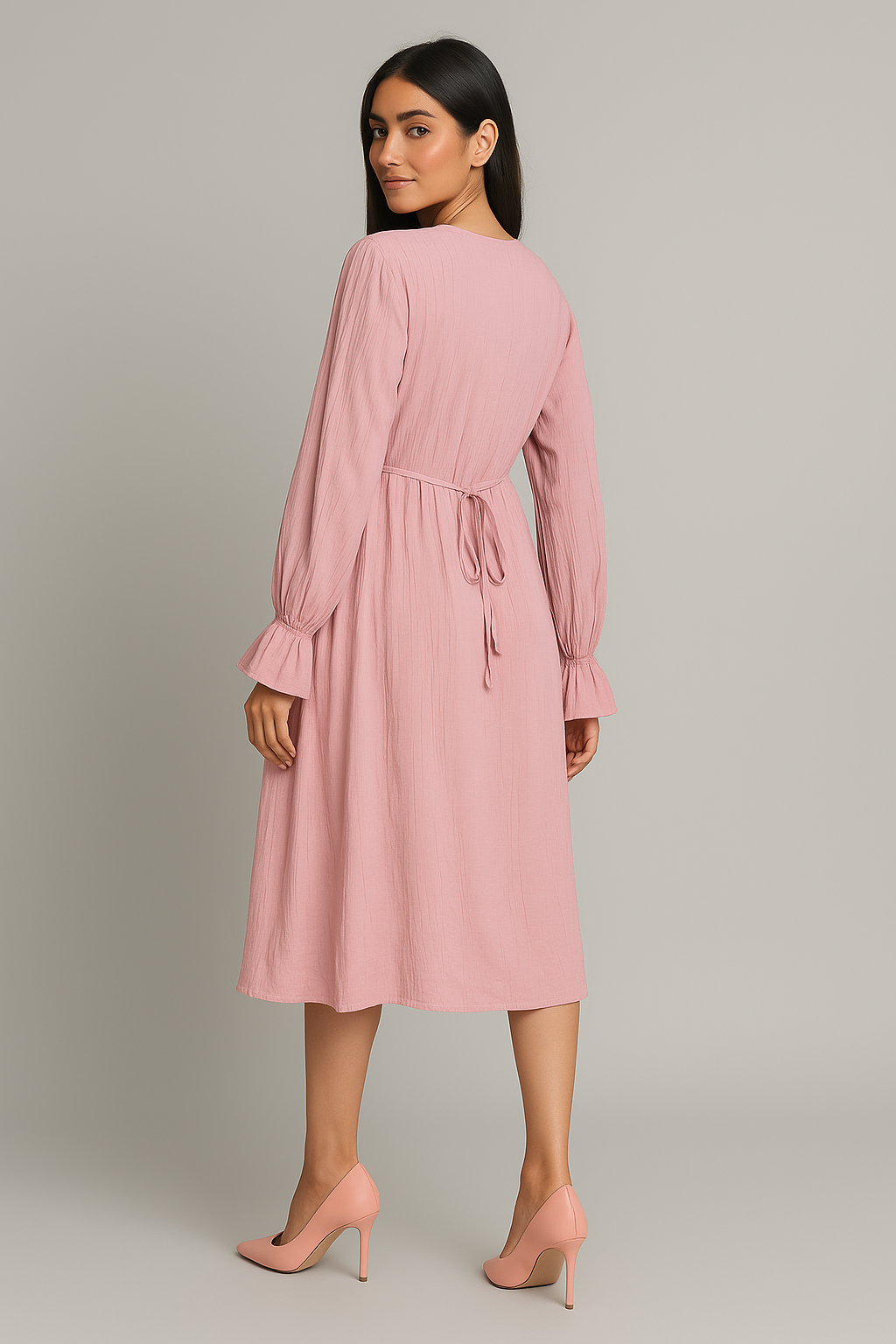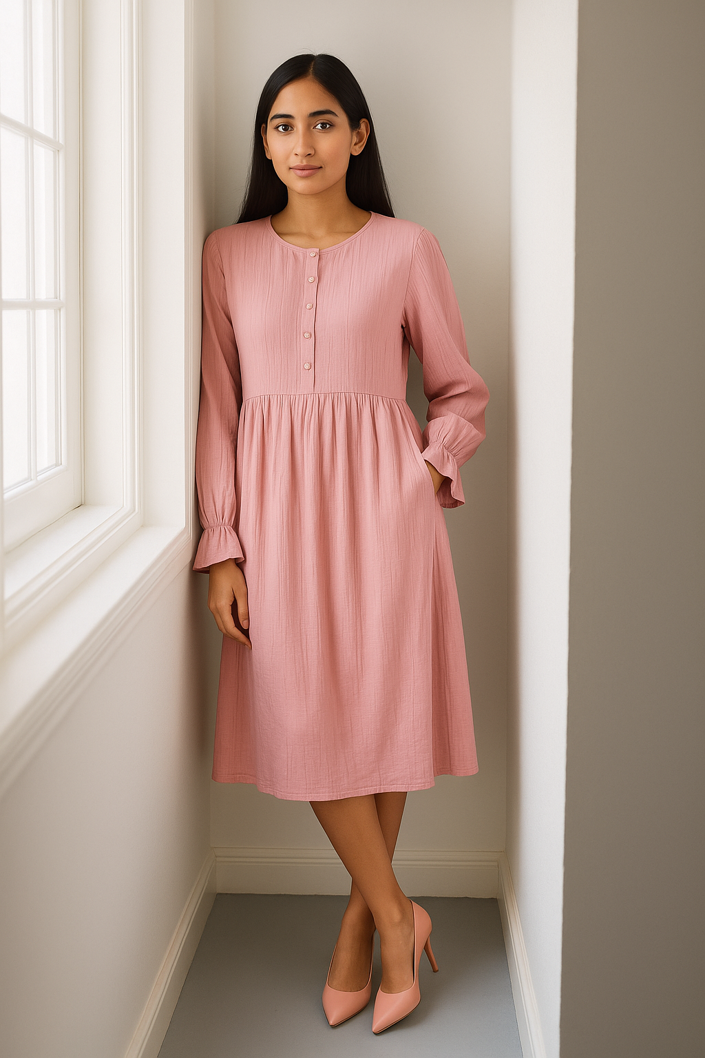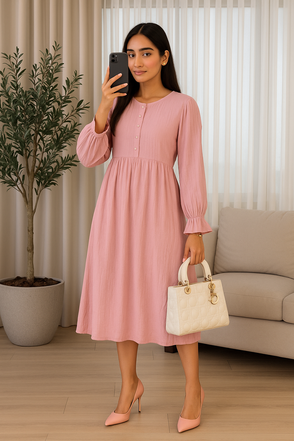 Elevate your everyday elegance with our Dusty Rose Midi Dress, designed in breathable cotton with a graceful, gathered waist and subtle front placket detailing. This dress brings a perfect blend of modest charm and minimalist sophistication. With full balloon sleeves ending in gentle frills and a fluid midi length, it’s ideal for coffee dates, casual workdays, or a relaxed evening out.