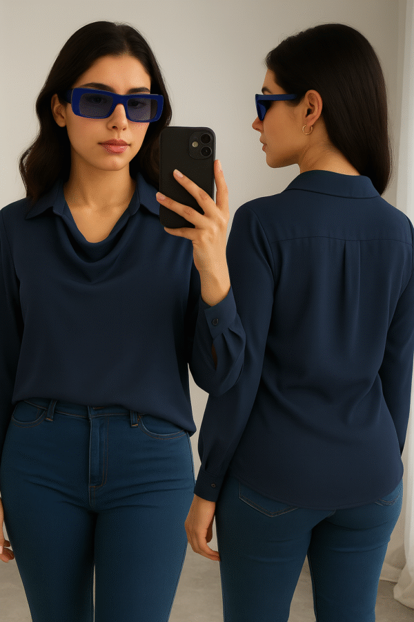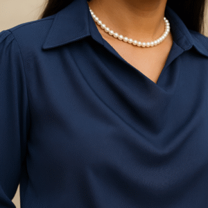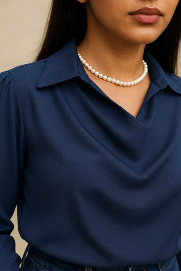 Step into timeless sophistication with our Navy Drape Collar Top, designed for women who appreciate versatility and refined style. The soft draped neckline is perfectly complemented by a detachable pearl necklace, allowing you to effortlessly switch between chic elegance and minimalist charm. Wear it with the necklace for a polished, statement lookβor tuck it away for understated sophistication. Perfect for workdays, evenings out, or casual strolls, this top brings two styles in one without compromising comfort or elegance.
