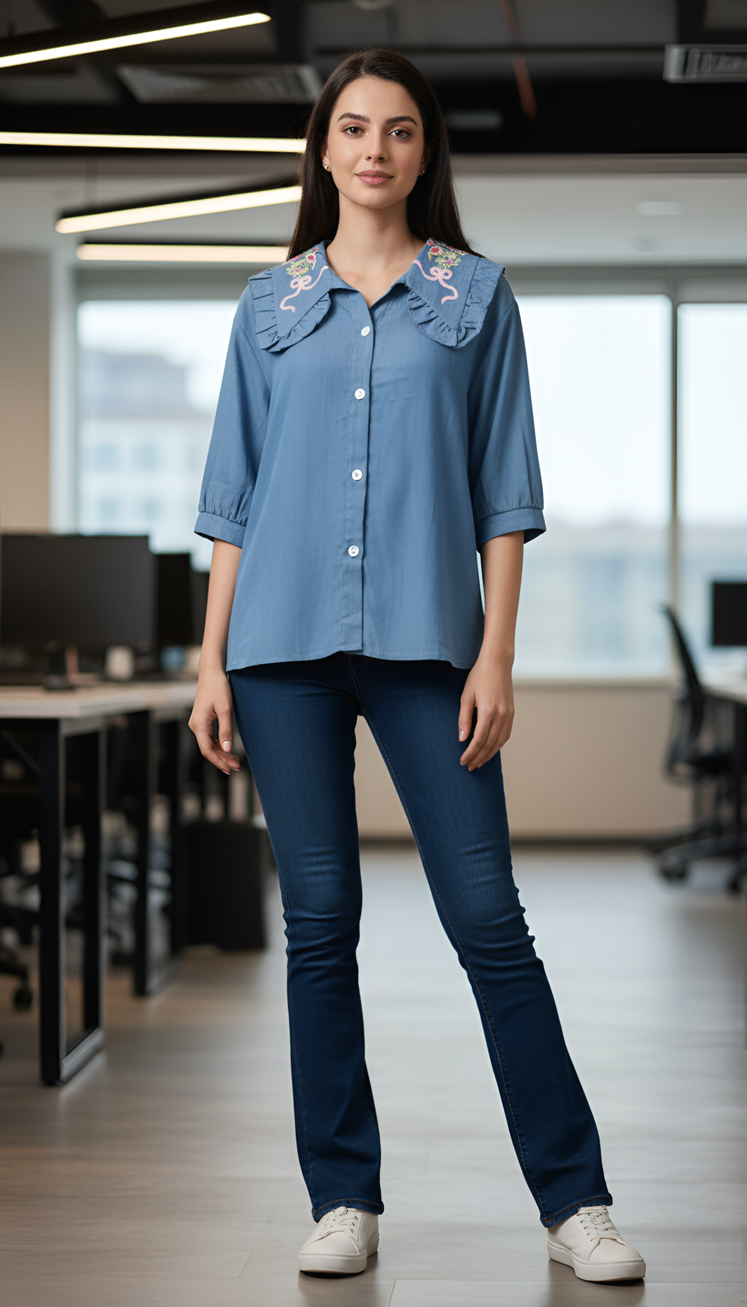 Elevate your wardrobe with this elegant embroidered blue shirt, designed to bring charm and comfort into your everyday style. Featuring a wide statement ruffle collar with delicate floral embroidery, this piece blends youthful playfulness with sophisticated elegance. The relaxed silhouette and three-quarter sleeves make it perfect for both work and leisure, while the pastel blue tone keeps it fresh, versatile, and effortlessly chic. A must-have designer shirt for casual outings, semi-formal settings, and office wear, crafted to turn everyday dressing into a statement.