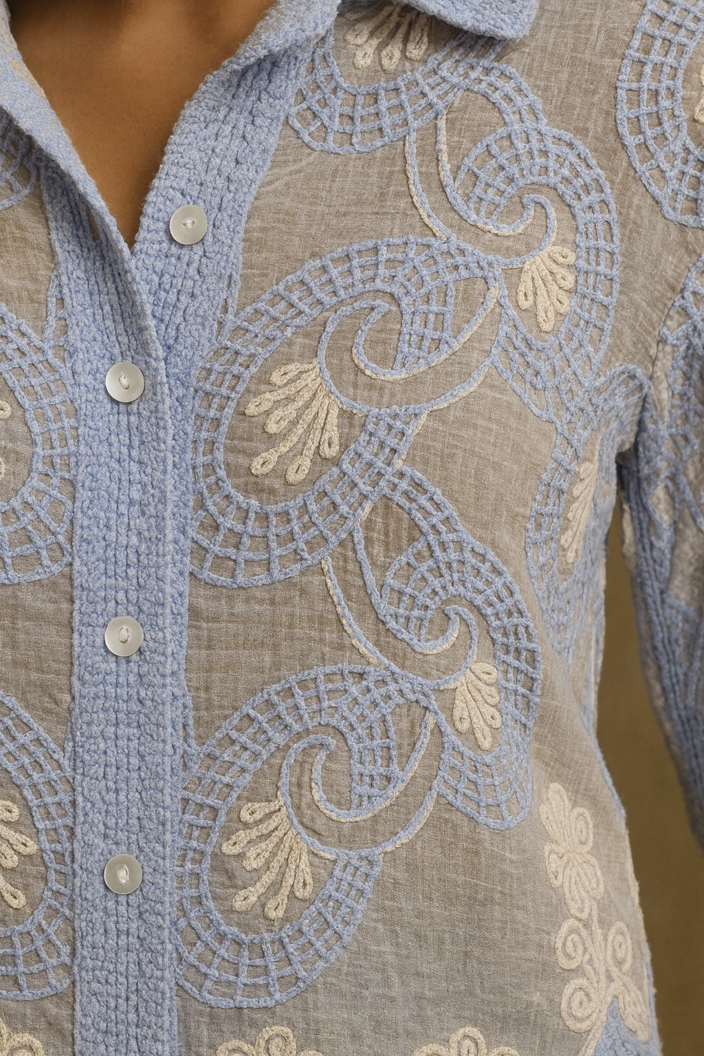 πΈ Intricate Embroidery: Elegant sky-blue and cream threadwork for a refined look