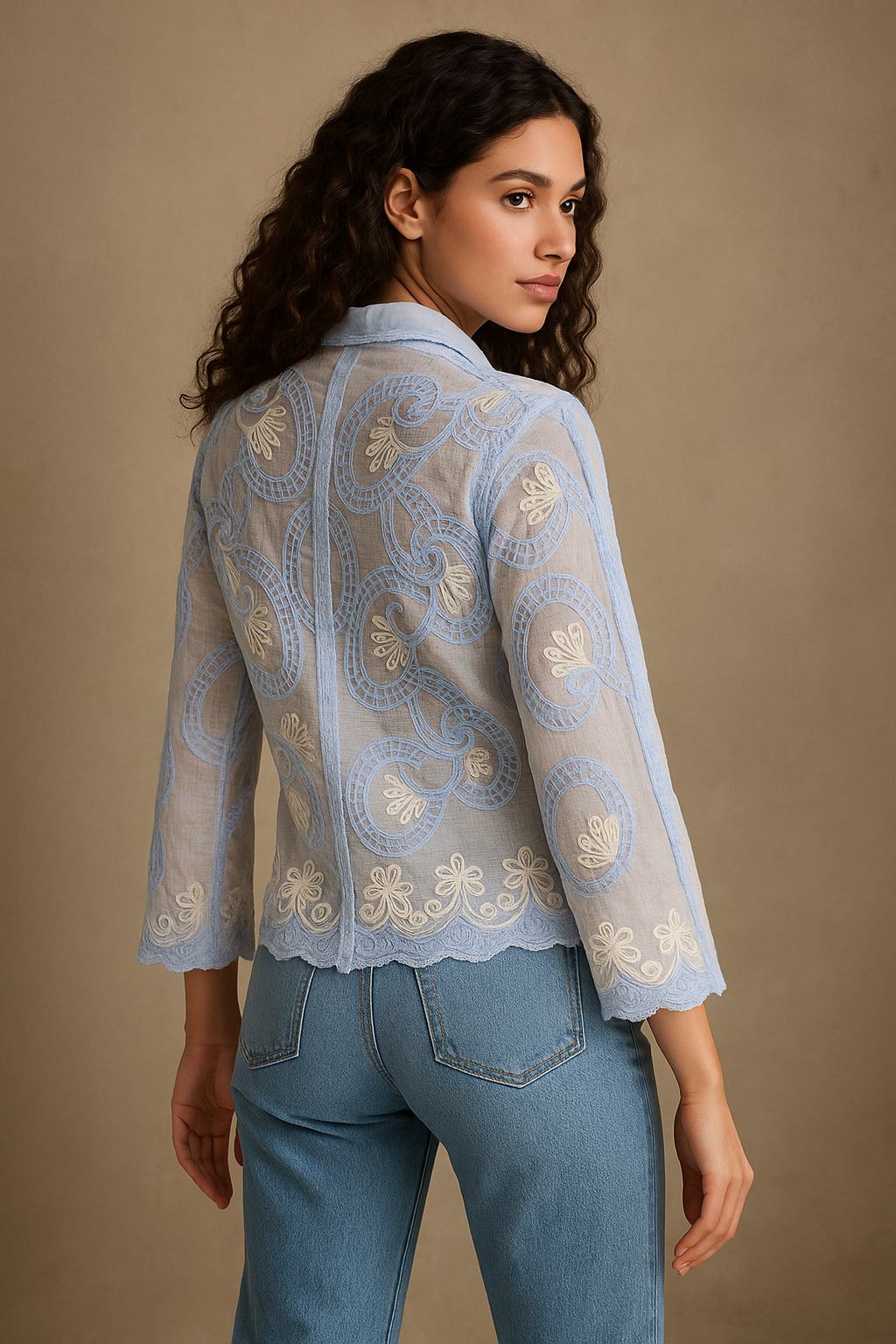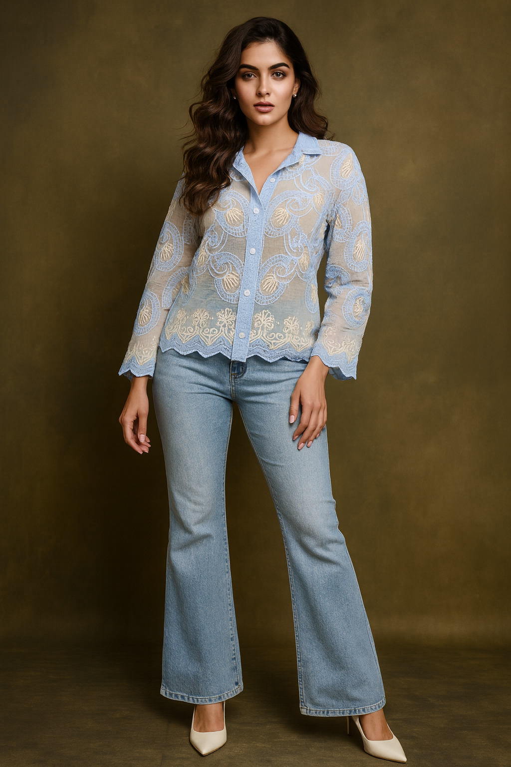 Step into effortless sophistication with our Ethereal Breeze Embroidered Sheer Shirt. Crafted from a delicate tissue-textured fabric, this sky-blue beauty is adorned with intricate cream and blue embroidery that exudes grace and charm. Its semi-sheer, lightweight feel gives you an airy elegance, while the scalloped hem and 3/4 sleeves add a romantic finish. Perfect for elevating your everyday look or making a statement on special outings, this shirt is where timeless elegance meets modern chic.