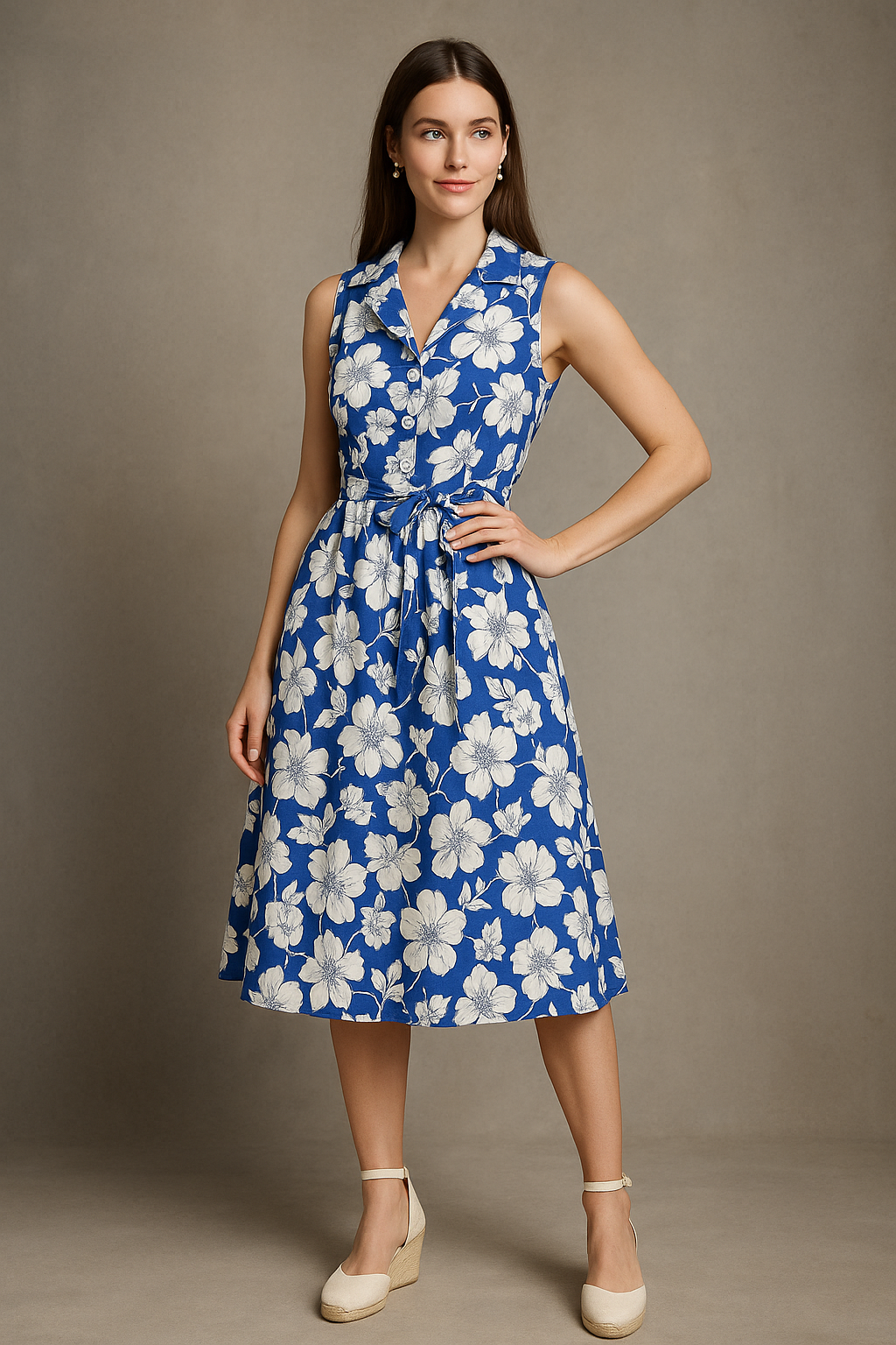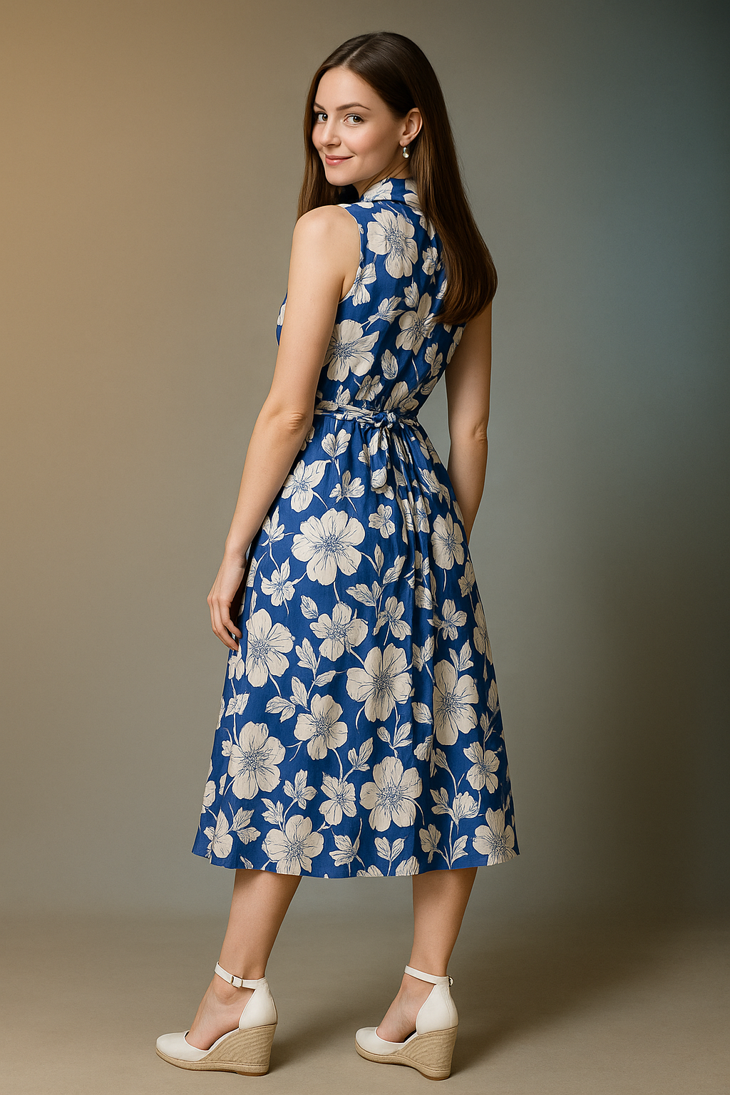 Step into timeless elegance with this Floral A-Line Midi Dress, designed to flatter every silhouette with effortless grace. The sleeveless cut brings a touch of modern chic, while the flowy A-line design ensures comfort and movement. Featuring a classic blue base adorned with delicate white floral prints, this dress strikes the perfect balance between sophistication and freshness.
