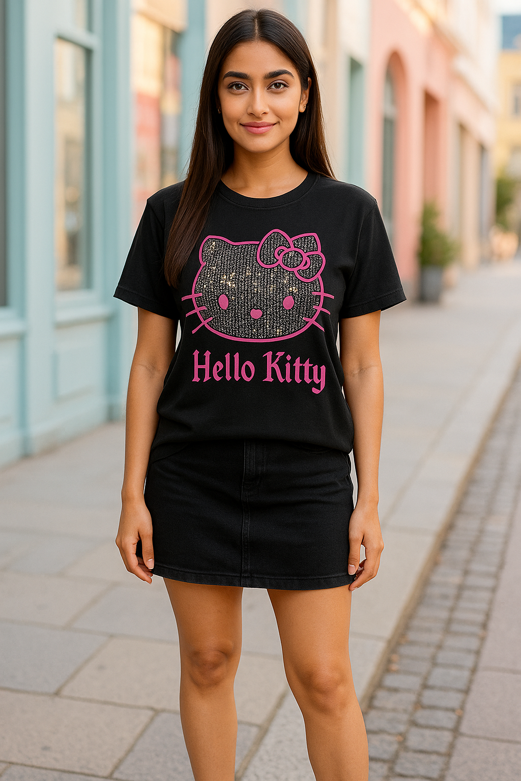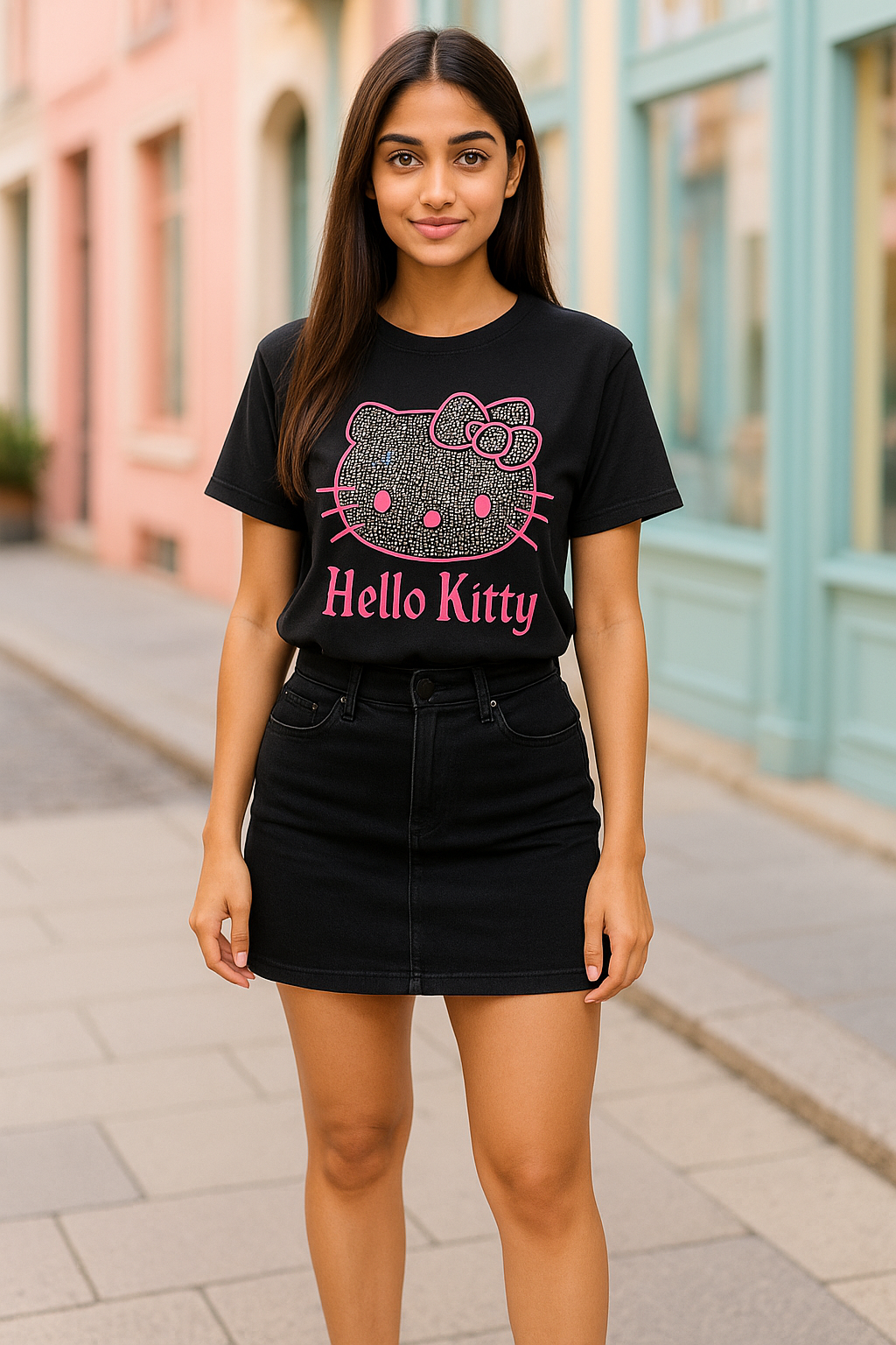 Step into playful charm and effortless chic with this Hello Kitty black graphic T-shirt – the perfect casual top for women who love to blend style with comfort. Designed with a sparkling Hello Kitty motif in shimmering rhinestone-style print and bold pink accents, this T-shirt brings nostalgic cuteness into modern streetwear fashion. Made with premium imported fabric, it offers a soft, breathable fit while making a bold style statement. Whether paired with skirts, jeans, or shorts, this designer casual T-shirt instantly elevates your everyday look with youthful elegance and fun appeal.