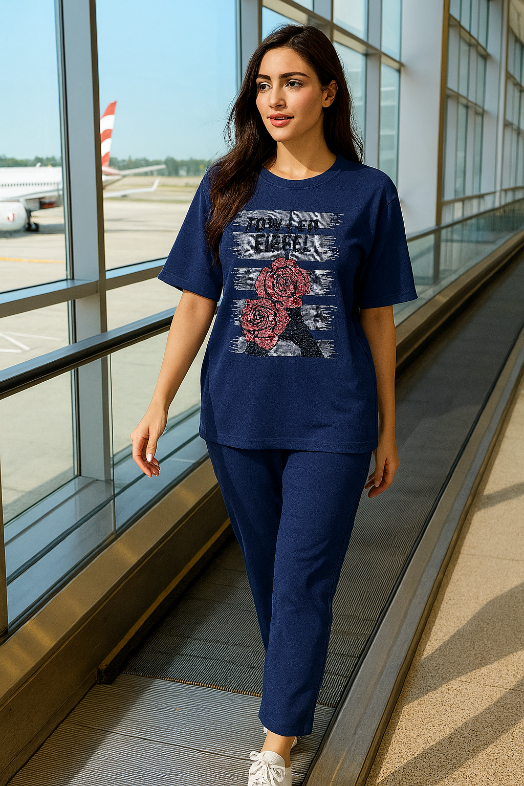 Turn travel days into a runway moment with our JetSet Chic Women’s Airport Co-ord Set in a rich navy blue. This effortlessly stylish two-piece is perfect for women who want to travel in comfort without compromising on elegance. The relaxed-fit Swarovski work tee with artistic rose detailing pairs seamlessly with matching straight-fit pants, making it an easy yet elevated look for airports, casual outings, or long journeys.