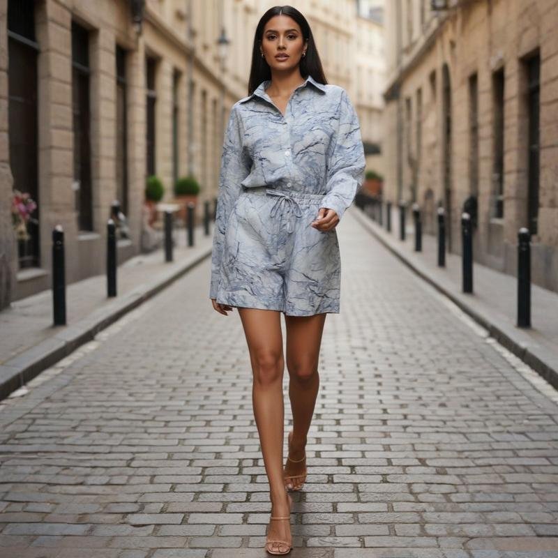 Elevate your style with the Marble Mist Co-Ord Dress with Shorts, a statement-making piece that blends contemporary charm with timeless sophistication. Featuring a marble-inspired print in soft blue-gray hues, this ensemble includes a relaxed long-sleeve top paired with chic matching shorts for a look that is both versatile and effortlessly fashionable.