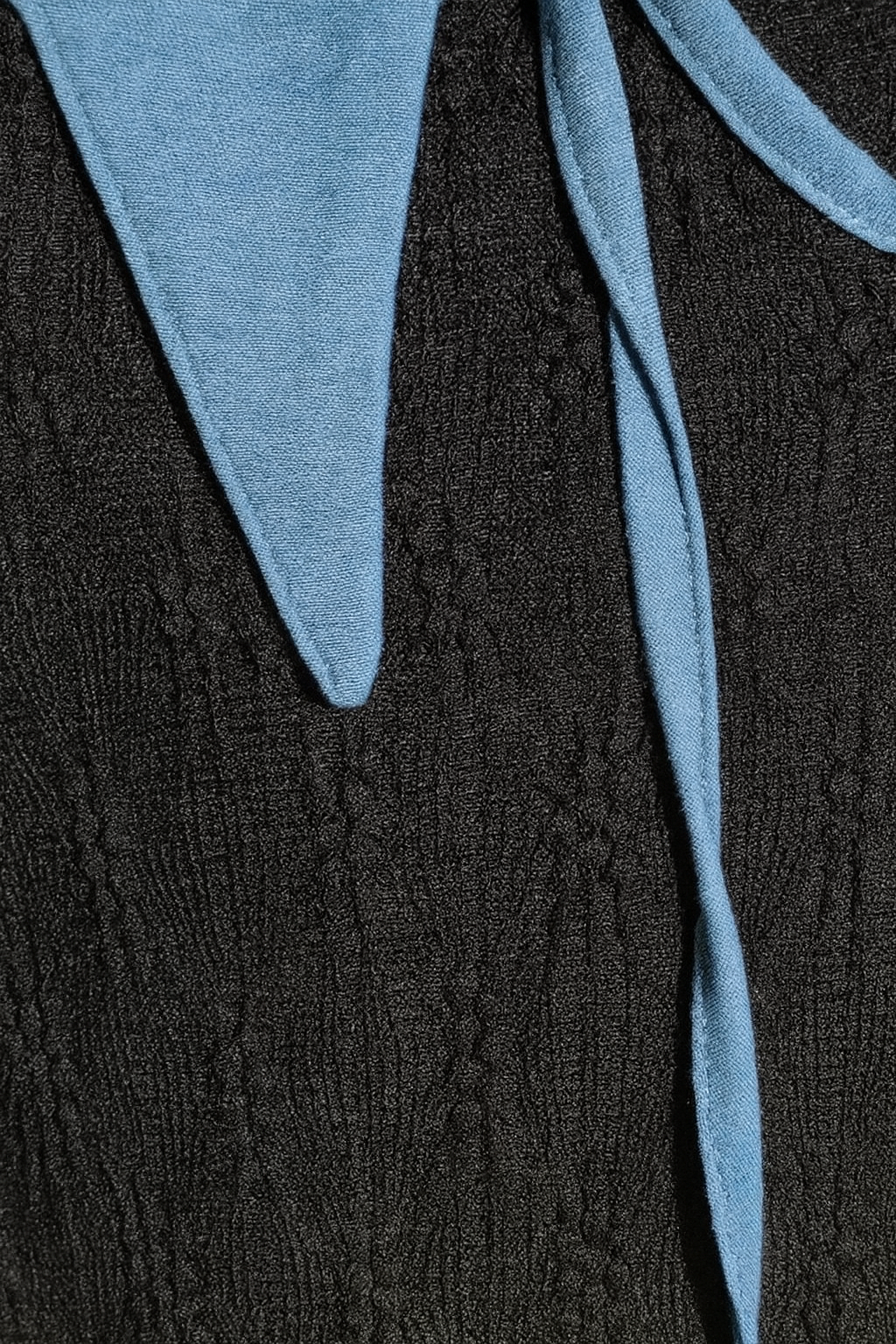 The Midnight Contrast Collar Top is where sleek sophistication meets modern flair. Crafted from premium imported fabric, this textured black top is elevated with a striking sky-blue pointed collar and tie detail, making it a true standout in any wardrobe.