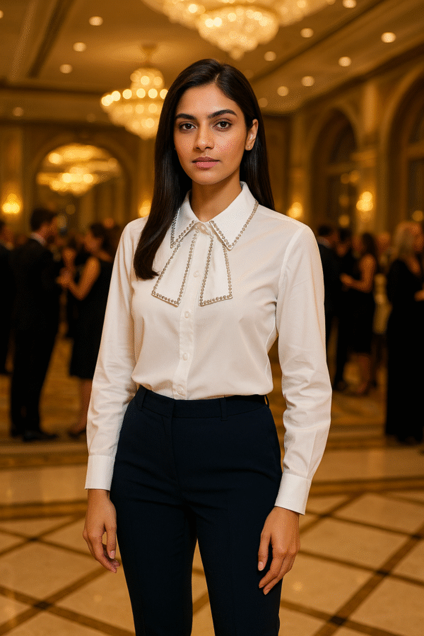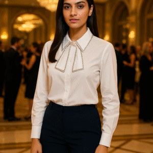 Illuminate the night with timeless elegance in our Midnight Glow Women’s Party Shirt. Designed for the woman who loves understated glamour, this crisp white shirt is adorned with delicately placed pearl embellishments along the collar and bow-tie outline, adding a touch of luxury to a classic silhouette.