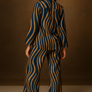 Turn heads with our Midnight Waves Women’s Striped Co-ord Set, a perfect fusion of bold design and effortless sophistication. This statement outfit features a striking navy base enhanced with fluid mustard wave stripes, creating a modern yet timeless appeal. The button-down shirt with a classic collar exudes sleek tailoring, while the wide-leg trousers offer comfort and an elongated silhouette.