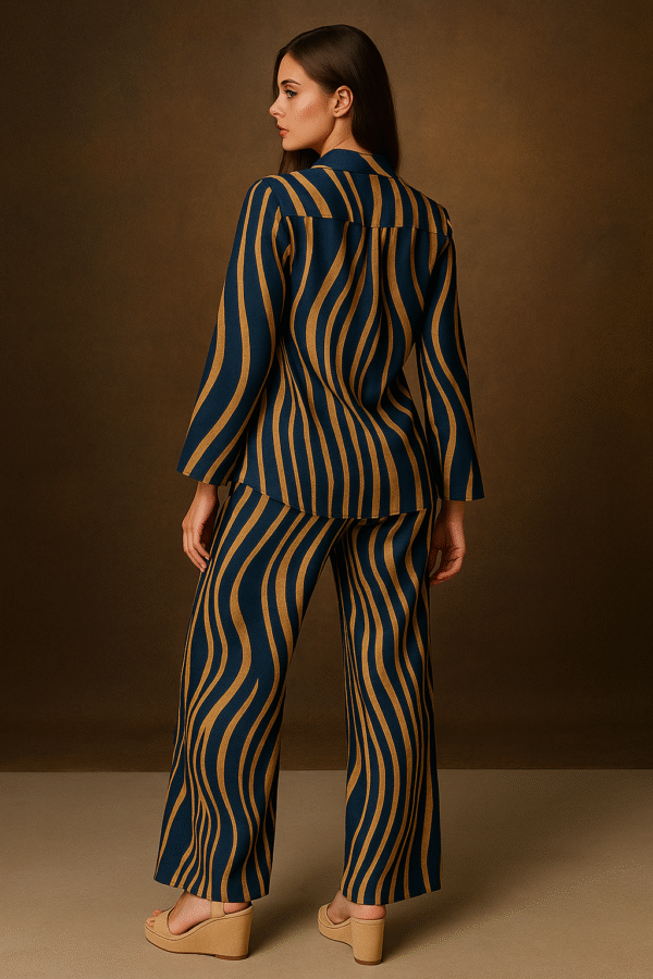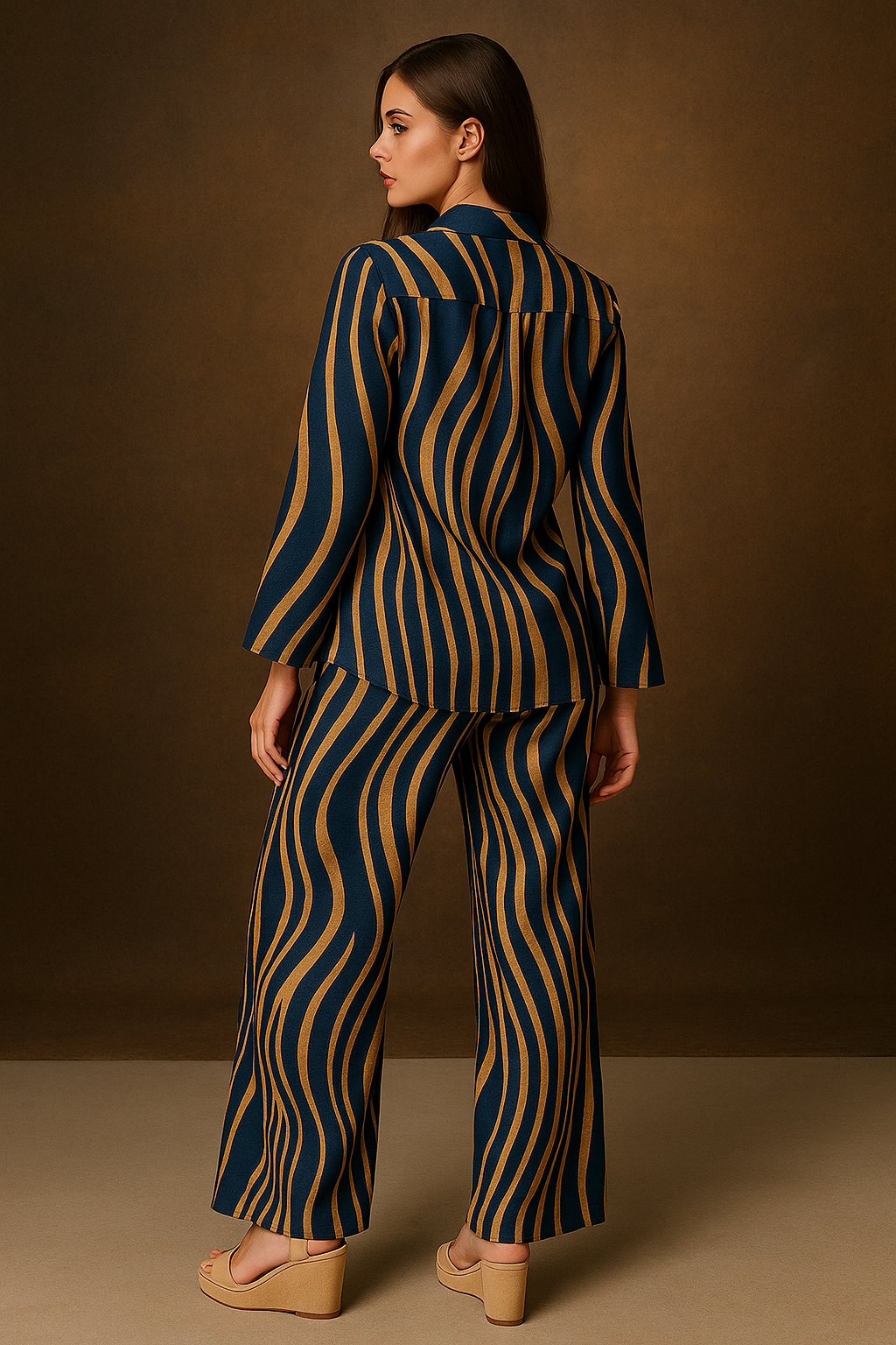✨ Bold Wave Stripes – Eye-catching navy & mustard pattern for a high-fashion look.