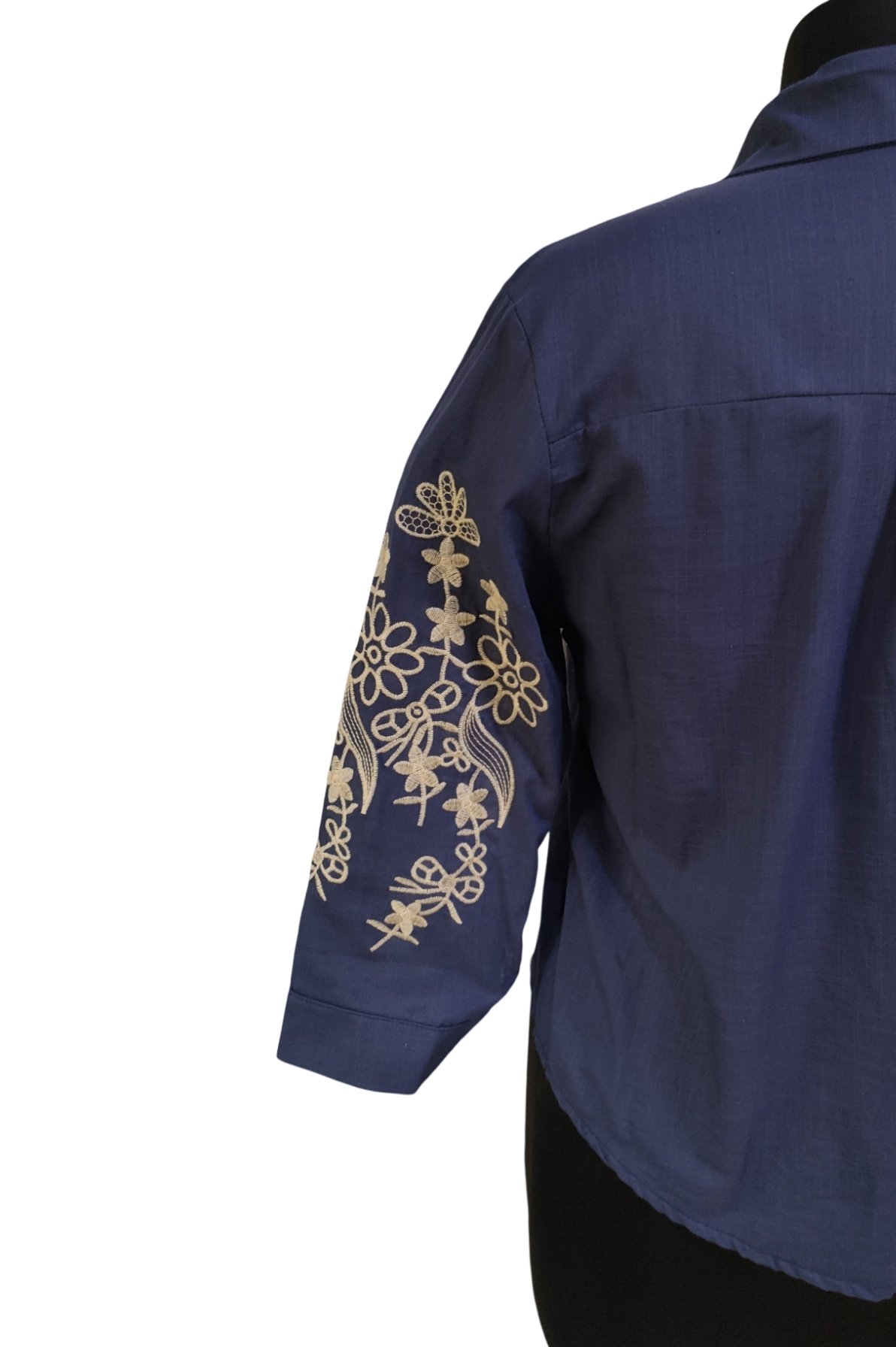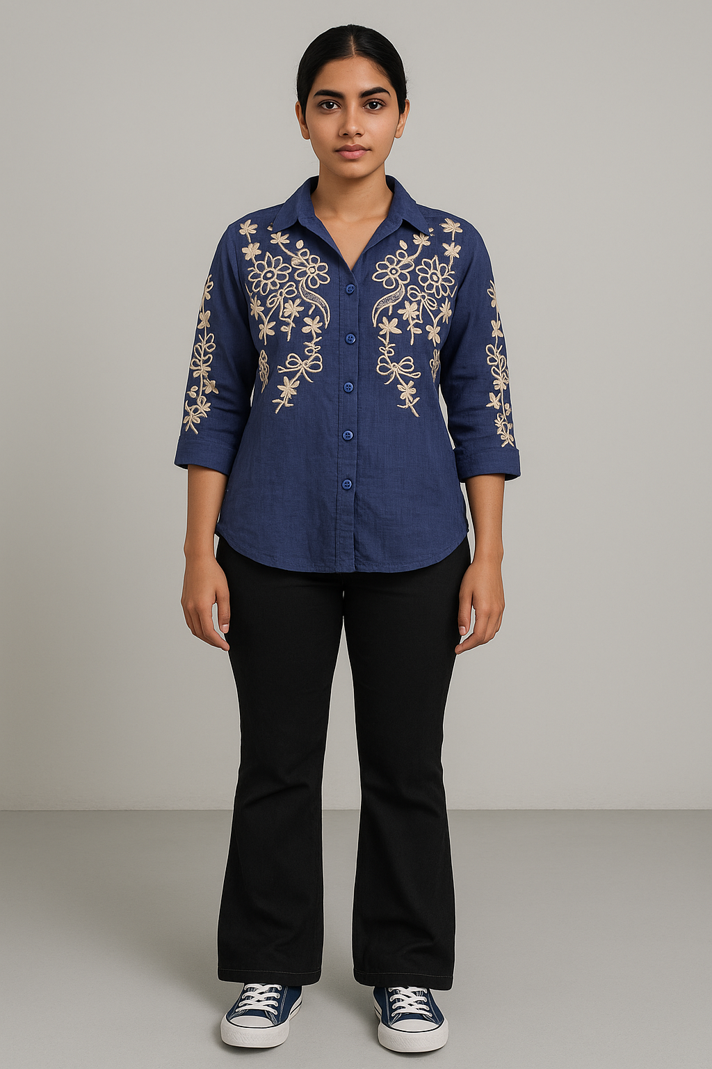 Delicately bold, the Noor shirt celebrates floral craftsmanship with a modern silhouette. Intricate ivory threadwork over deep navy blue makes this piece a wardrobe essential for the woman who seeks poise, power, and grace in every setting.
