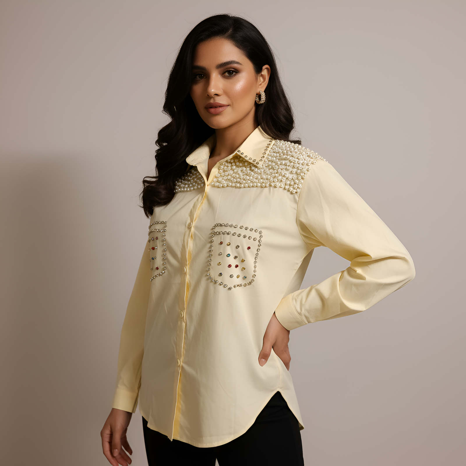 Turn heads with this exquisite designer party shirt, crafted to perfection for women who love elegance with a bold twist. Adorned with delicate pearl detailing across the shoulders and shimmering crystal embellishments on the pockets, this shirt is a statement piece that blends sophistication with glamour. The soft pastel yellow hue elevates the mood with a fresh and radiant appeal, making it ideal for both chic daytime outings and glamorous evening parties. Designed in premium imported fabric, it offers a flawless drape, ensuring you look effortlessly stylish at every occasion.