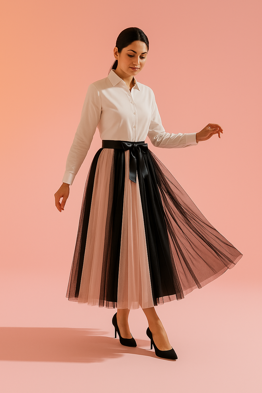 Float through day or night in this two‑tone pleated tulle midi skirt. Panels of blush pink and inky black create a striking contrast, while a sleek satin waist tie softly cinches the silhouette. Lightweight layers move beautifully with every step, making this the perfect statement piece for special moments and refined everyday style.