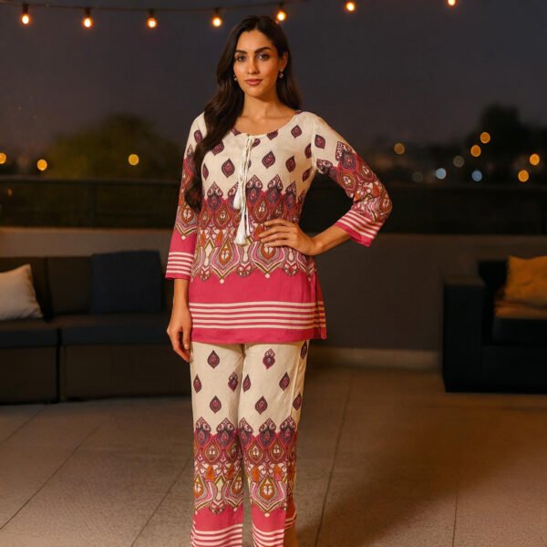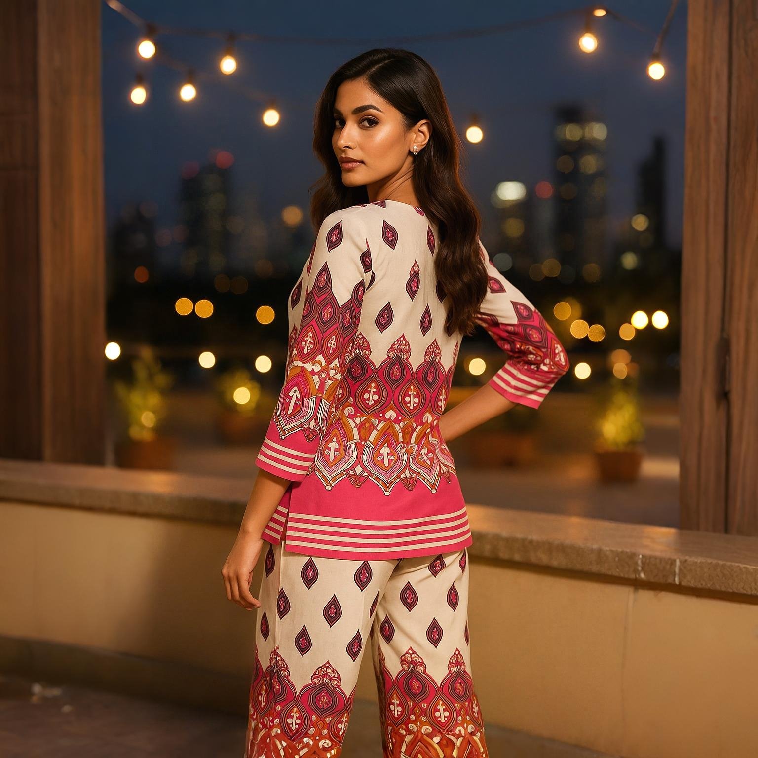 Step into elegance with the Radiant Twilight Co-ord Dress, where tradition meets modern flair. Designed in a striking ivory canvas adorned with rose-pink and sunset-orange motifs, this set exudes effortless sophistication. The intricate patterns bring a sense of cultural artistry, while the clean silhouette makes it versatile and chic. Perfectly balancing comfort and grace, this co-ord dress elevates your style from intimate gatherings to festive evenings, making it a timeless wardrobe investment crafted from premium imported fabric.