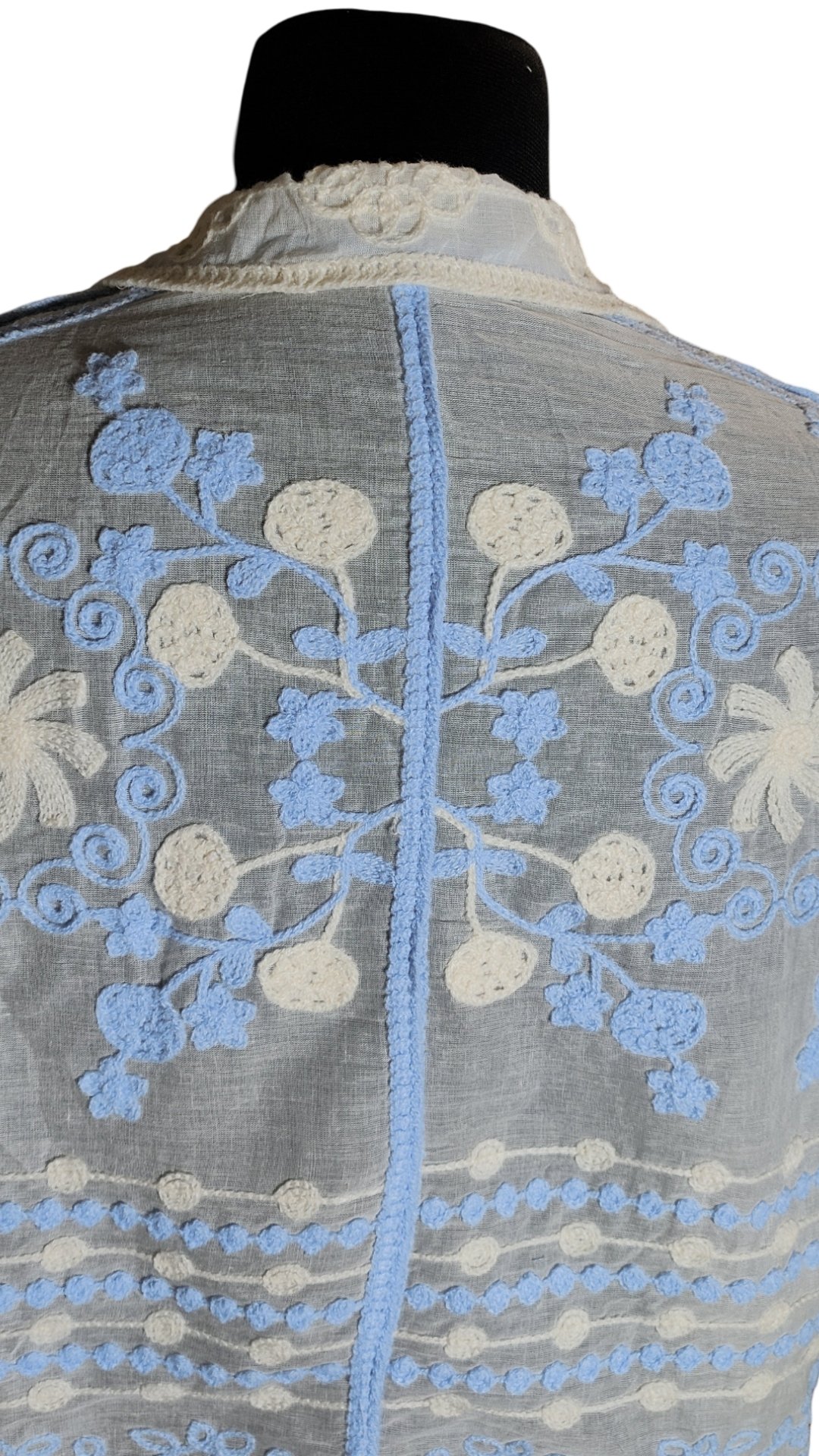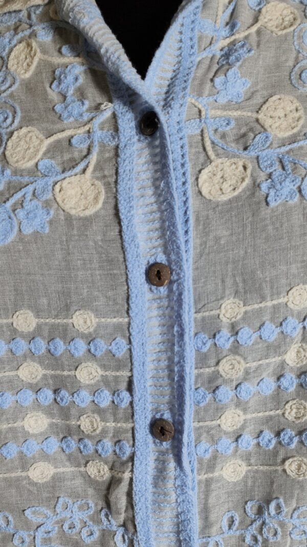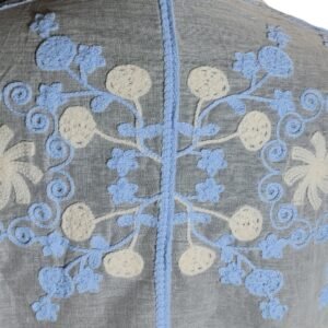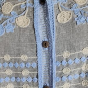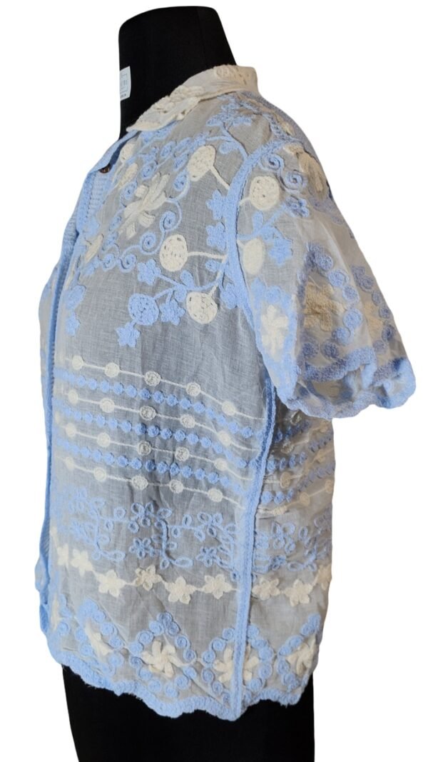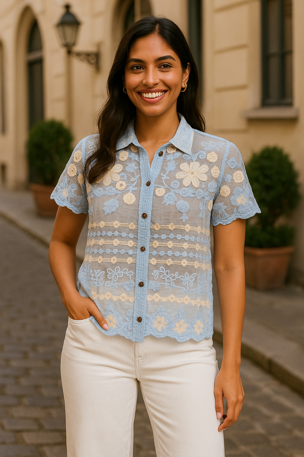 Elevate your wardrobe with this Sky Bloom Embroidered Sheer Shirt, featuring delicate floral lace embroidery in soft pastel tones over a light blue sheer base. The scalloped hemline, short sleeves, and button-down front give it an elegant yet relaxed vibe, making it perfect for both casual days and special outings. Its intricate craftsmanship and breathable fabric ensure you stay stylish and comfortable all day.