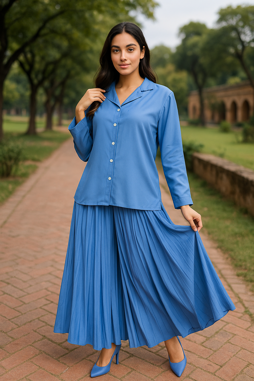 Redefine elegance with our Slate Elegance Pleated Co-ord Set, a masterpiece in muted sophistication. The set features a tailored button-down shirt with a notched collar and wide-leg pleated trousers in a refined greyish-blue tone that exudes quiet confidence.