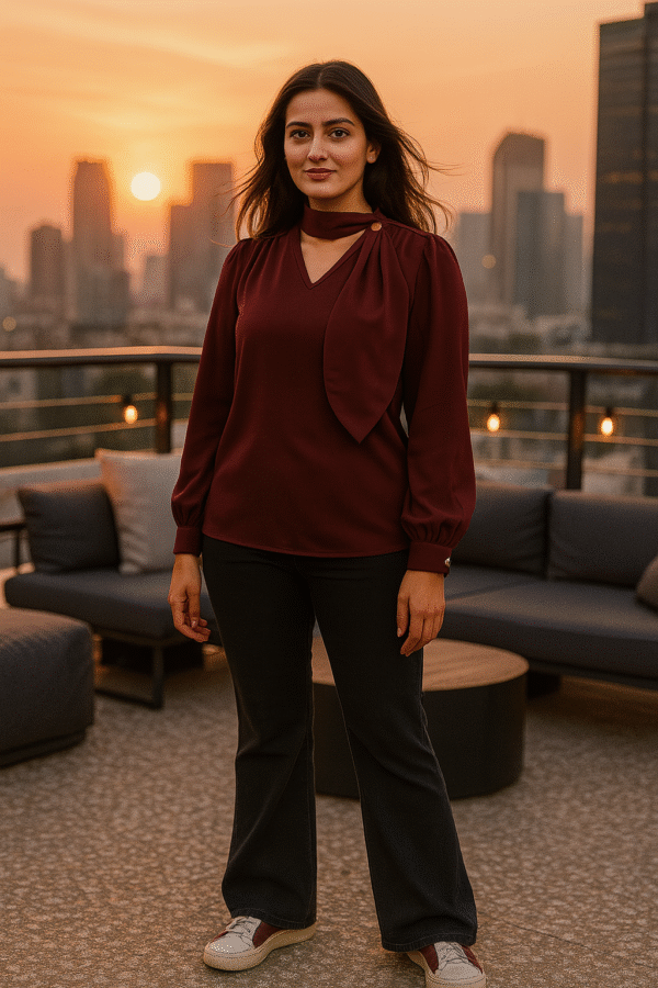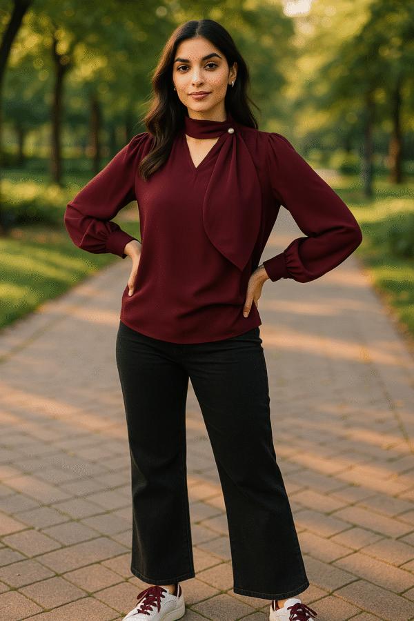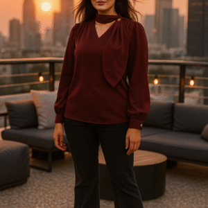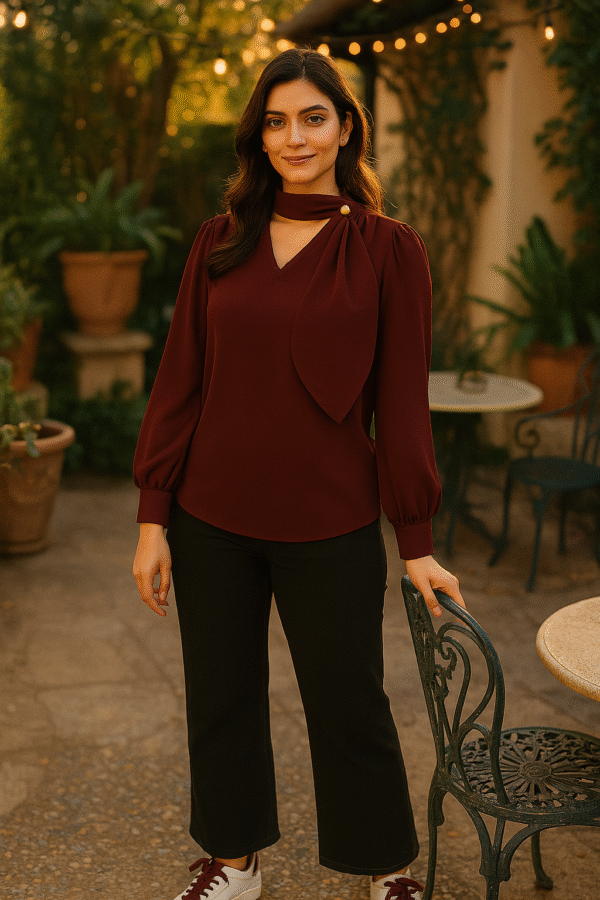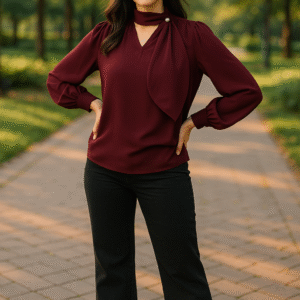 Step into refined sophistication with our Wine Elegance Designer Drape Neck Top β€” a statement piece that radiates style and grace. Crafted in a deep wine hue, this premium imported fabric creation features an artfully draped neckline detail with a gold-tone button accent, giving it the illusion of a scarf without the bulk. The bishop sleeves with cuffed ends add movement and charm, while the tailored fit ensures a flattering silhouette. Perfect for workdays, gallery strolls, or elegant evenings, this top is your ticket to timeless fashion.