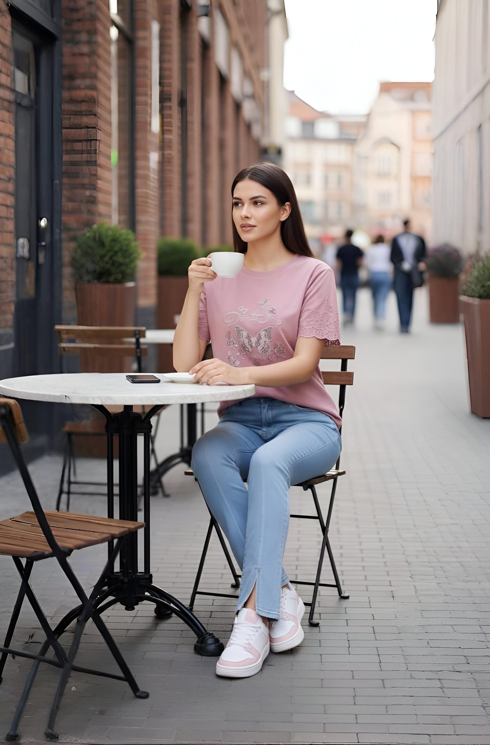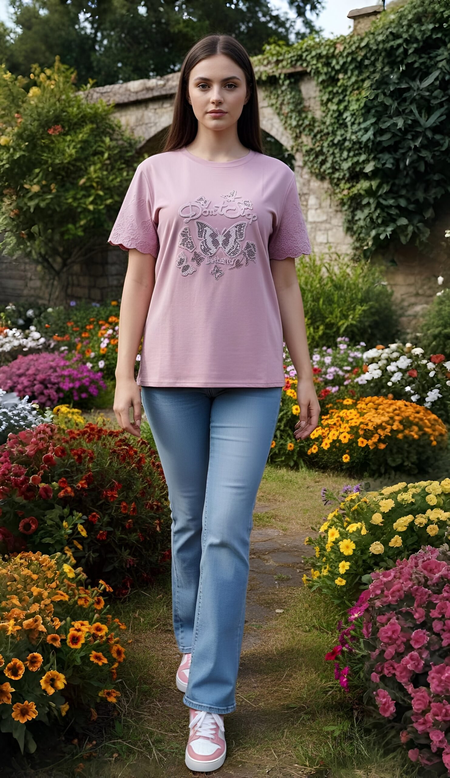 Elevate your everyday style with the Wings of Grace T-Shirt, a dreamy blend of comfort and elegance. Crafted from premium imported fabric, this blush-toned top captures attention with its dazzling rhinestone butterfly embellishments that shimmer with every move. The delicate lace sleeves add a romantic touch, while the modern silhouette makes it perfect for casual strolls, chic brunches, or relaxed evenings out. A versatile wardrobe essential that gracefully balances comfort with fashion-forward detail.