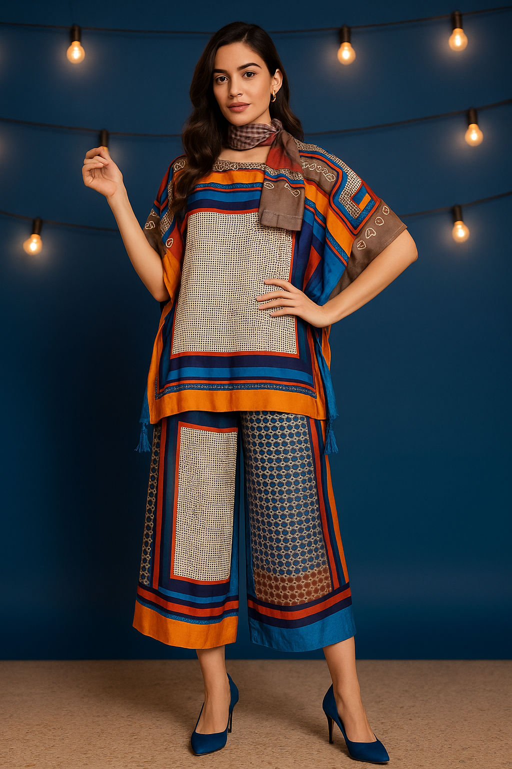 Step into effortless sophistication with the Women Co-ord Dress – Boho Luxe Kaftan Elegance, a statement outfit designed for women who love comfort with style. Featuring vibrant geometric and bohemian-inspired prints in earthy orange, royal blue, and warm brown, this co-ord set offers a chic kaftan-style top paired with wide-leg bottoms. Crafted in premium imported fabric, the flowy silhouette ensures breathability, ease, and a graceful drape. Perfect for brunches, festive gatherings, or chic city outings, this co-ord dress transitions seamlessly from casual to semi-formal wear, making it a timeless addition to your wardrobe.